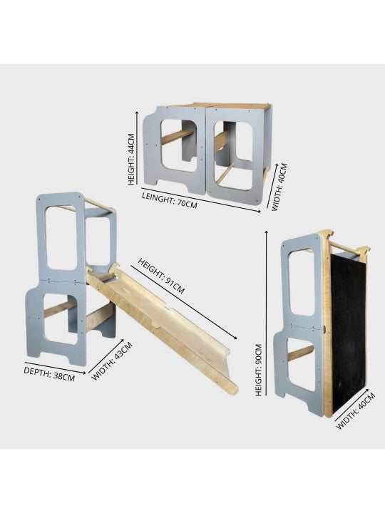 - Fungerer som læringstårn, bord, rutsjebane og tavle