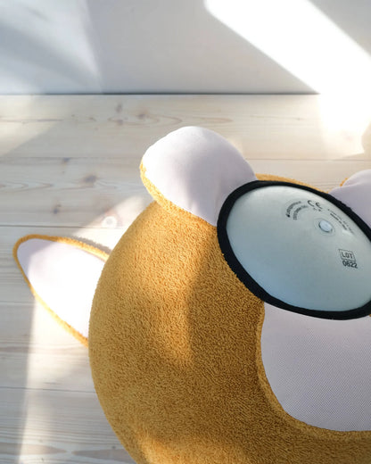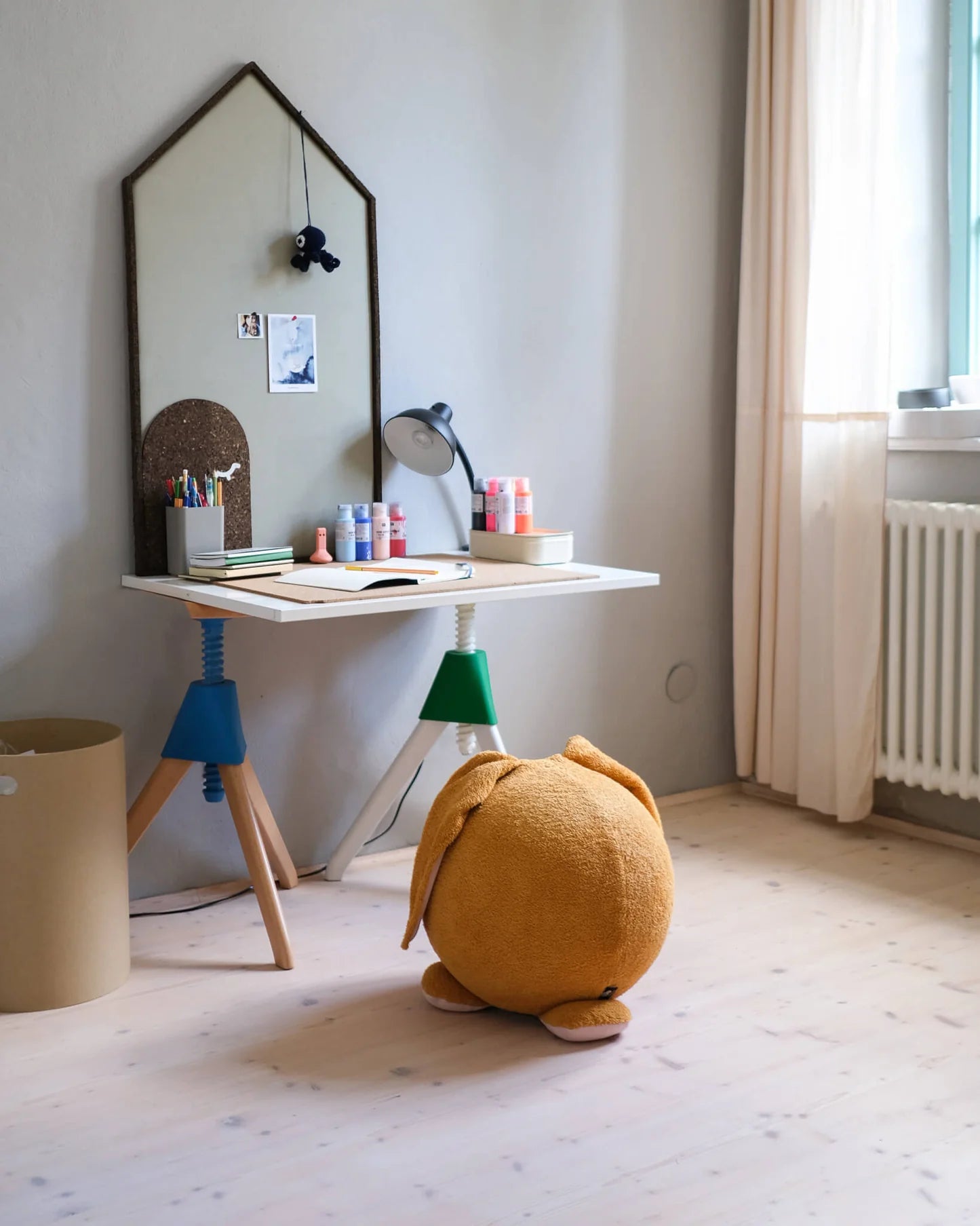 Med sine tre støttepunkter – to poter og en lille hale – står “da” stabilt og triller ikke væk. Han venter tålmodigt på næste runde leg og bringer både bevægelse og ro ind i hjemmet som et blødt, stilfuldt legeomøbel.
