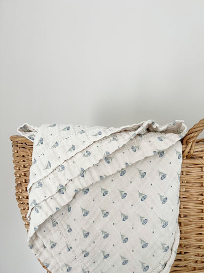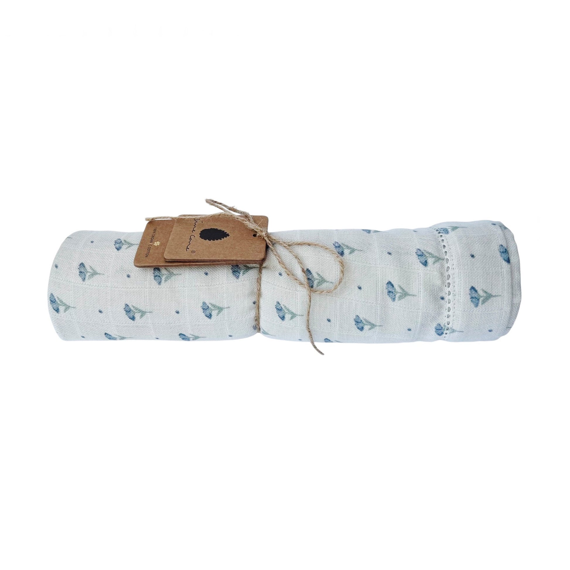 Pine Cone Björk svøb i det fine Flower Dot-mønster er vævet i 100% økologisk bomuld og afsluttet med en smuk fagoting langs kanten. Det bløde svøb giver tryghed til den nyfødte, når barnet pakkes ind, og kan senere bruges som et let tæppe på lune sommeraftener eller som en stor, blød krammeklud til hygge.