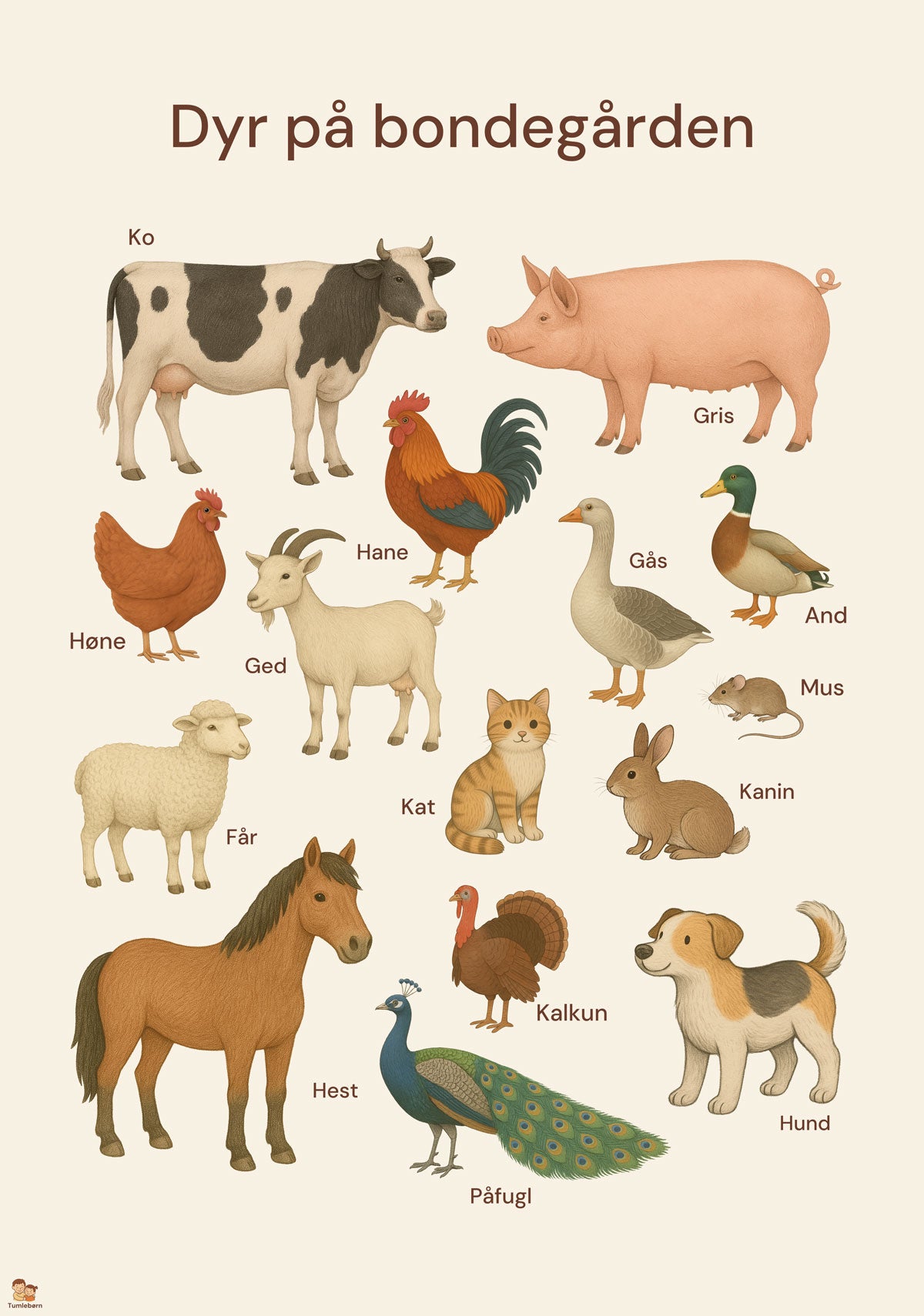 - 12 bondegårdsdyr: Ko, Gris, Får, Hest, Ged, Høne, Hane, And, Gås, Hund, Kat og Kanin