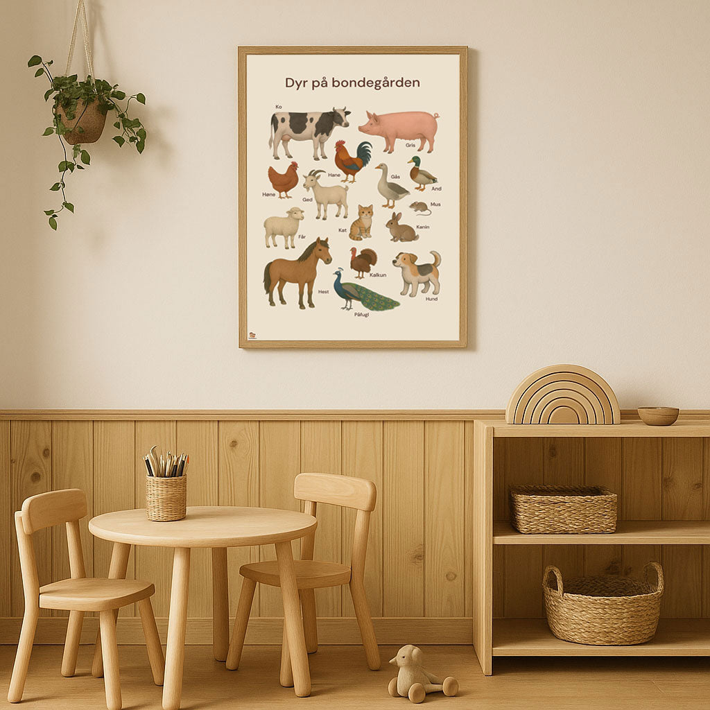 Gør værelset ekstra levende med denne smukke plakat fyldt med 12 klassiske bondegårdsdyr – alle tegnet i Tumlebørns varme og legende streg.