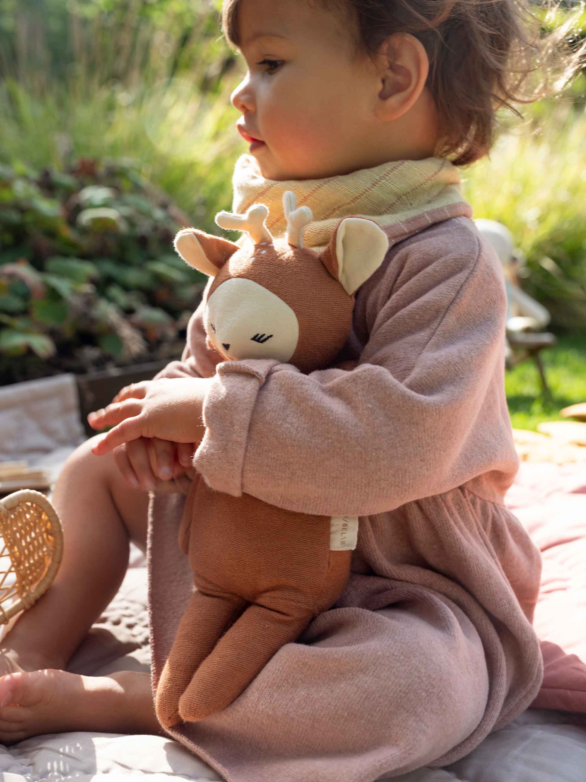 Fiona er lavet i blød, økologisk bomuld og fyldt med majsfiber og genanvendt polyester – en kombination, der gør hende både krammeklar og bæredygtig. Hendes størrelse er perfekt til små arme og store eventyr.