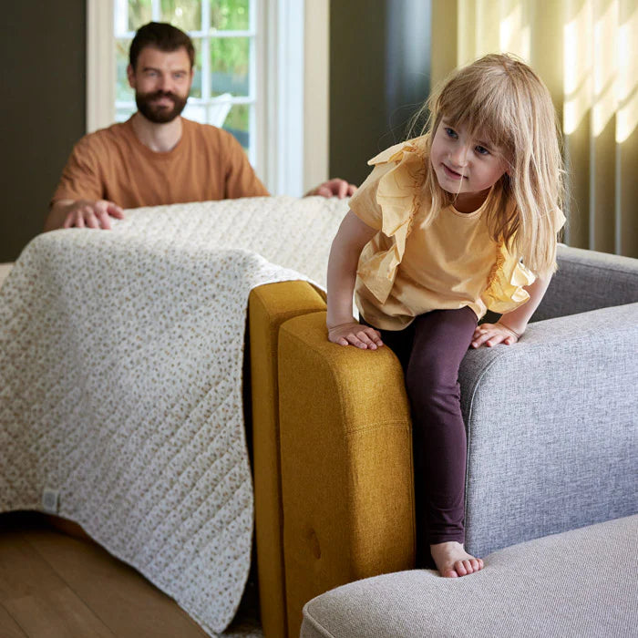 Sofaen har en sammenklappelig ryglænsløsning og kan placeres frit i rummet. Den leveres med en pude, som kan bruges til at skabe forskellige siddepositioner og ekstra komfort. Den er let at flytte rundt og ideel som midlertidig gæsteseng – fx når et barn kryber ind i soveværelset midt om natten for at sove tæt på forældrene.