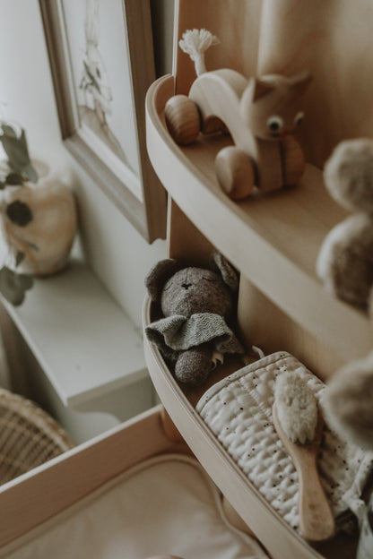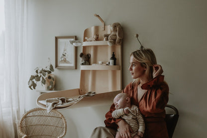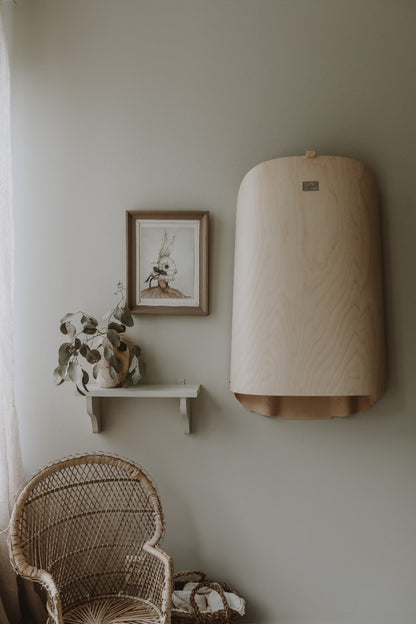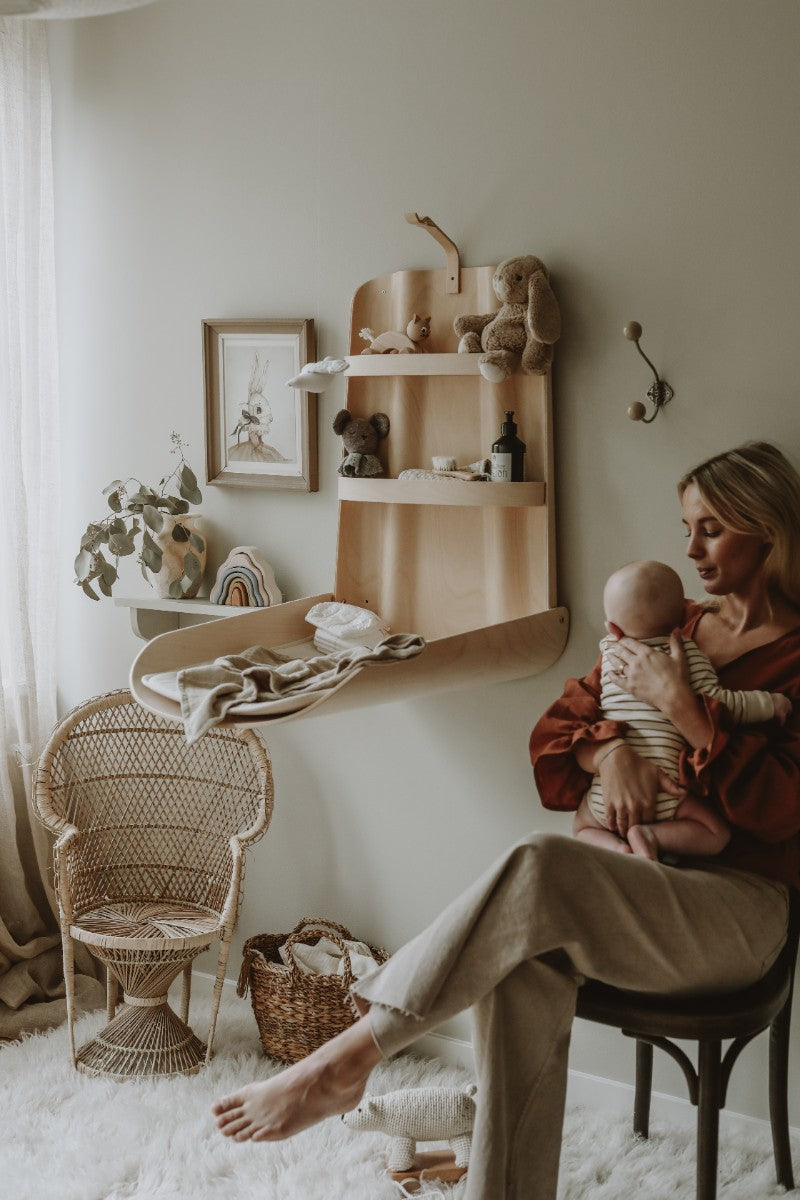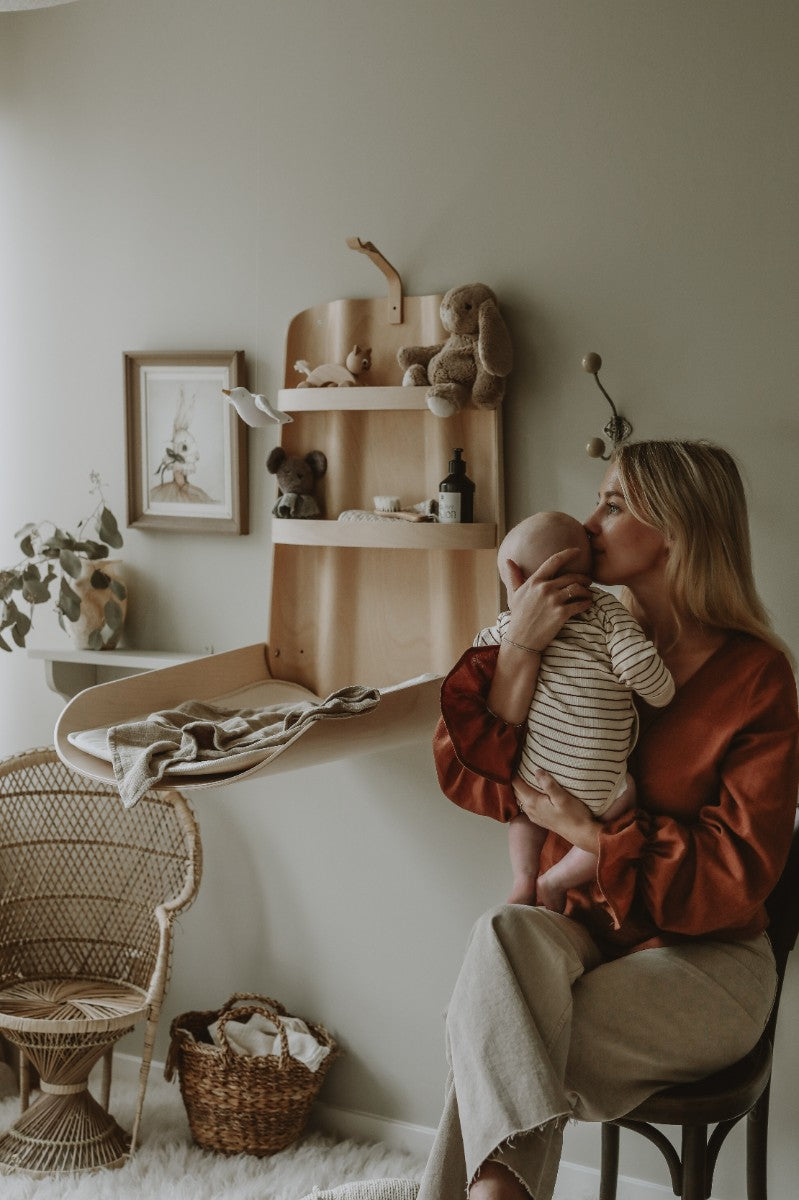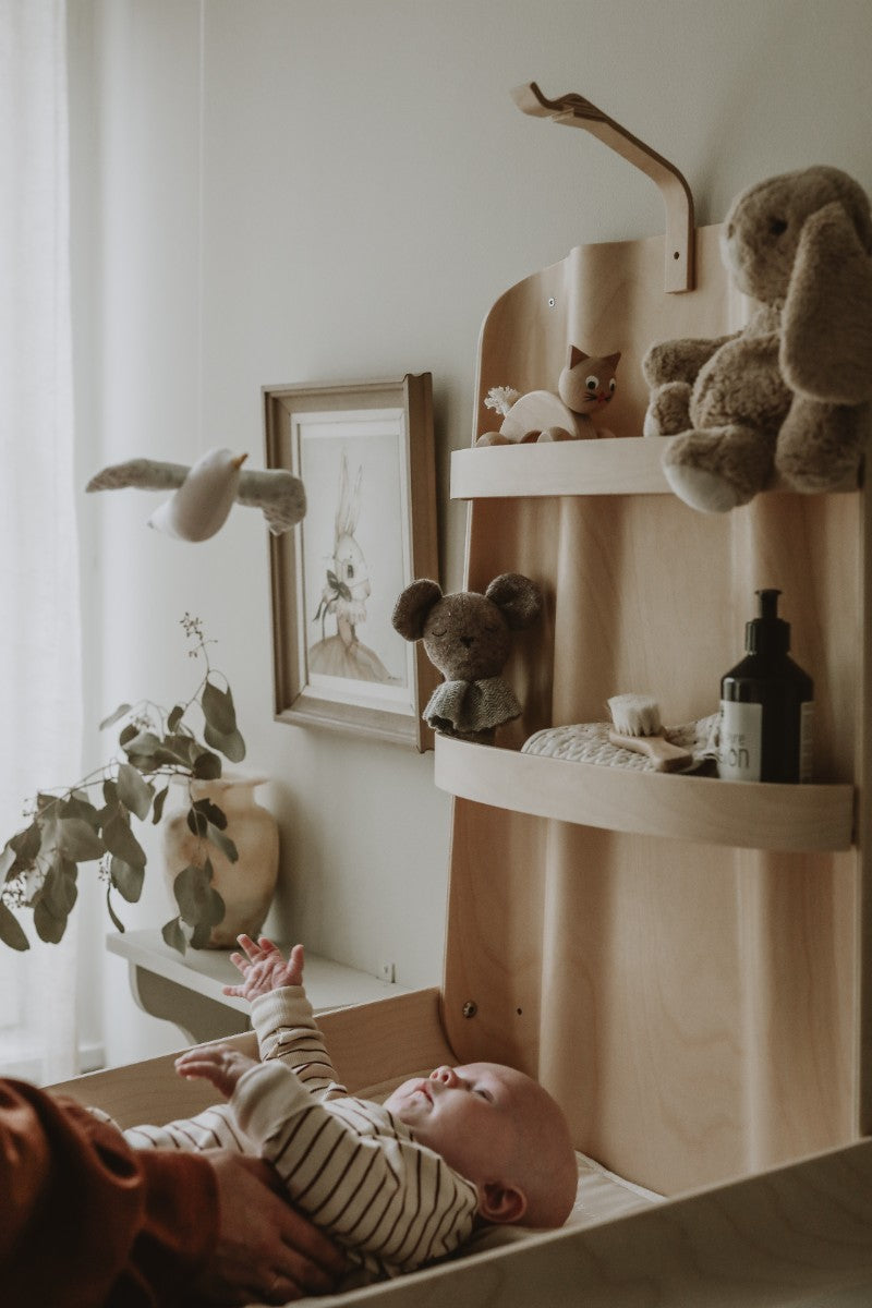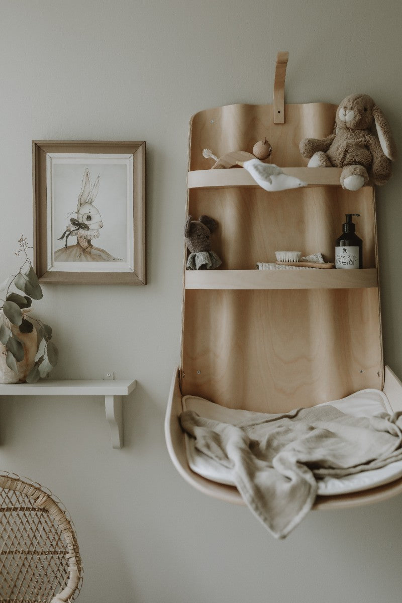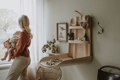 Når puslebordet ikke er i brug, kan det nemt klappes sammen, så det kun fylder minimalt på væggen. Det gør Nathi til et oplagt valg for familier, der ønsker en gennemtænkt, æstetisk og pladsbesparende løsning i babyhverdagen.
