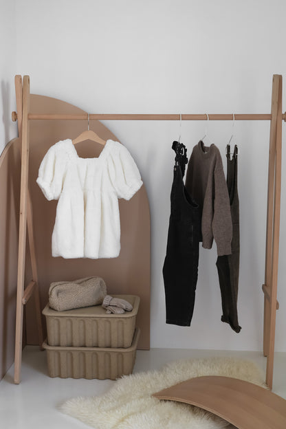 Grow tøjstativet kan justeres i 3 højder, så det vokser med barnet. Det giver mulighed for, at barnet selv kan vælge og hænge sit tøj op – en enkel måde at lære livsfærdigheder som selvpåklædning, orden og organisering.