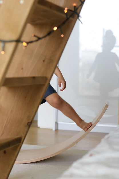 Brættets underside er beklædt med blød filt, som beskytter gulvet mod ridser og giver skridsikkerhed. Det kan bruges som bro, vippe, siddeplads eller som et kreativt element i legen – kun fantasien sætter grænser.