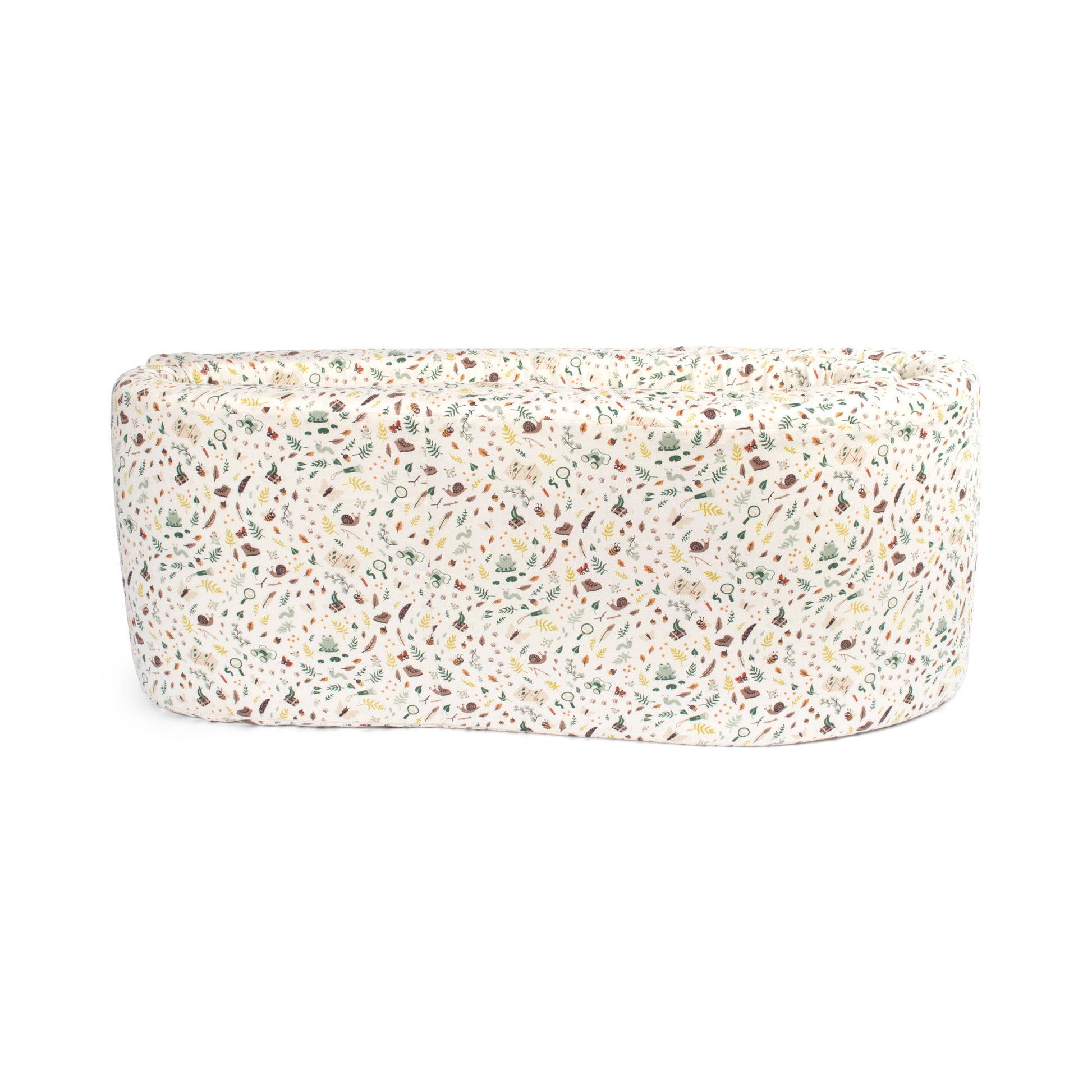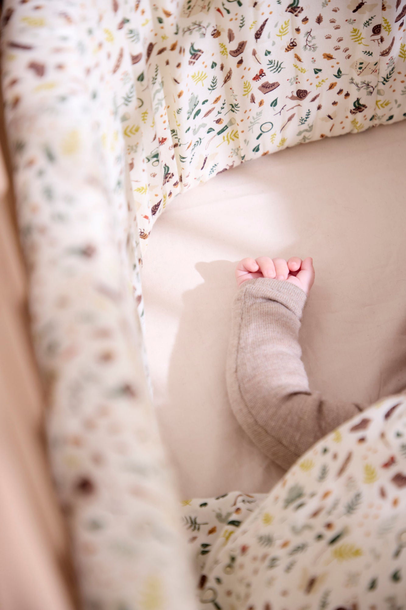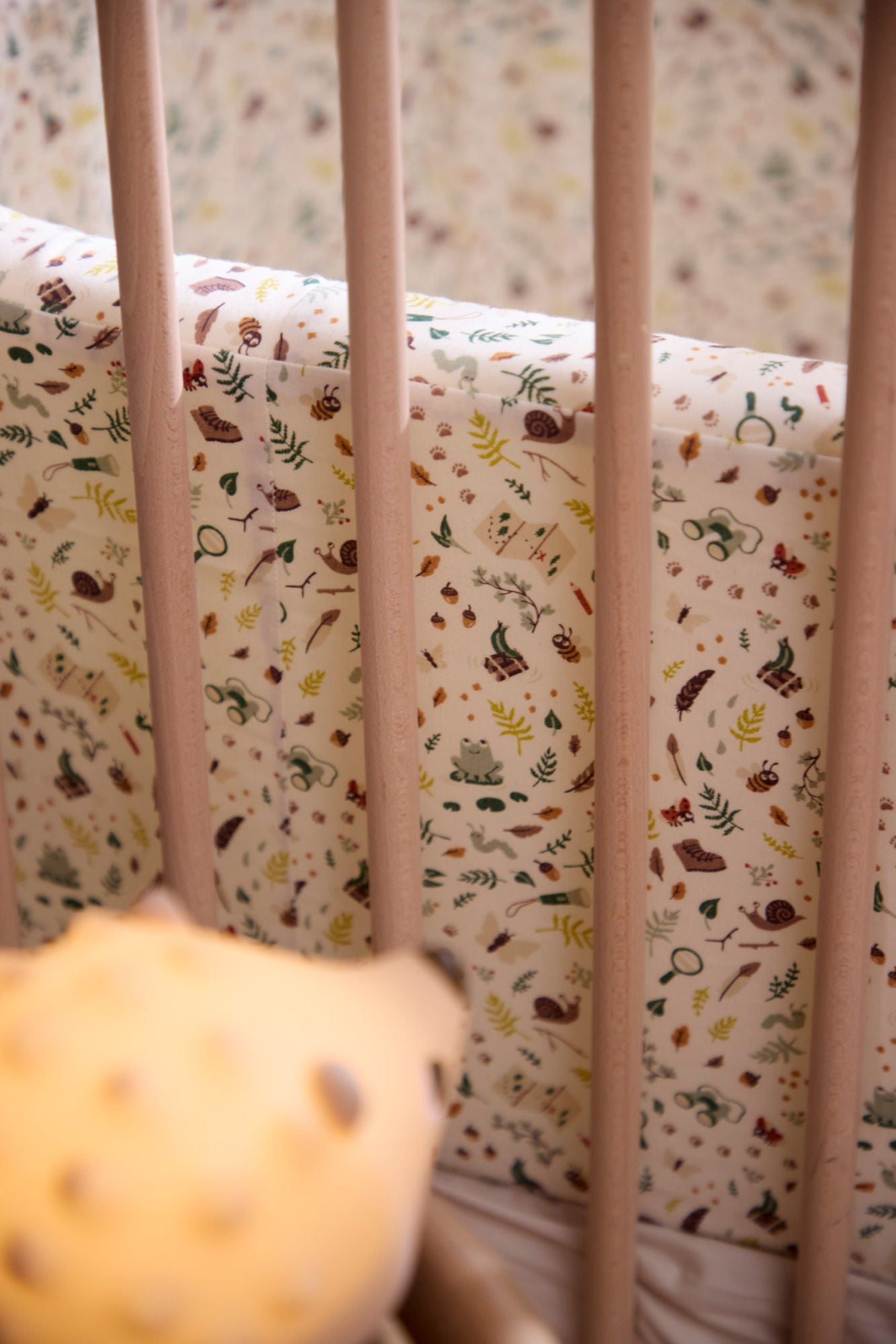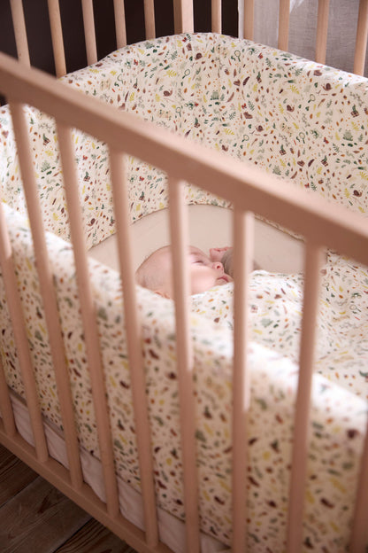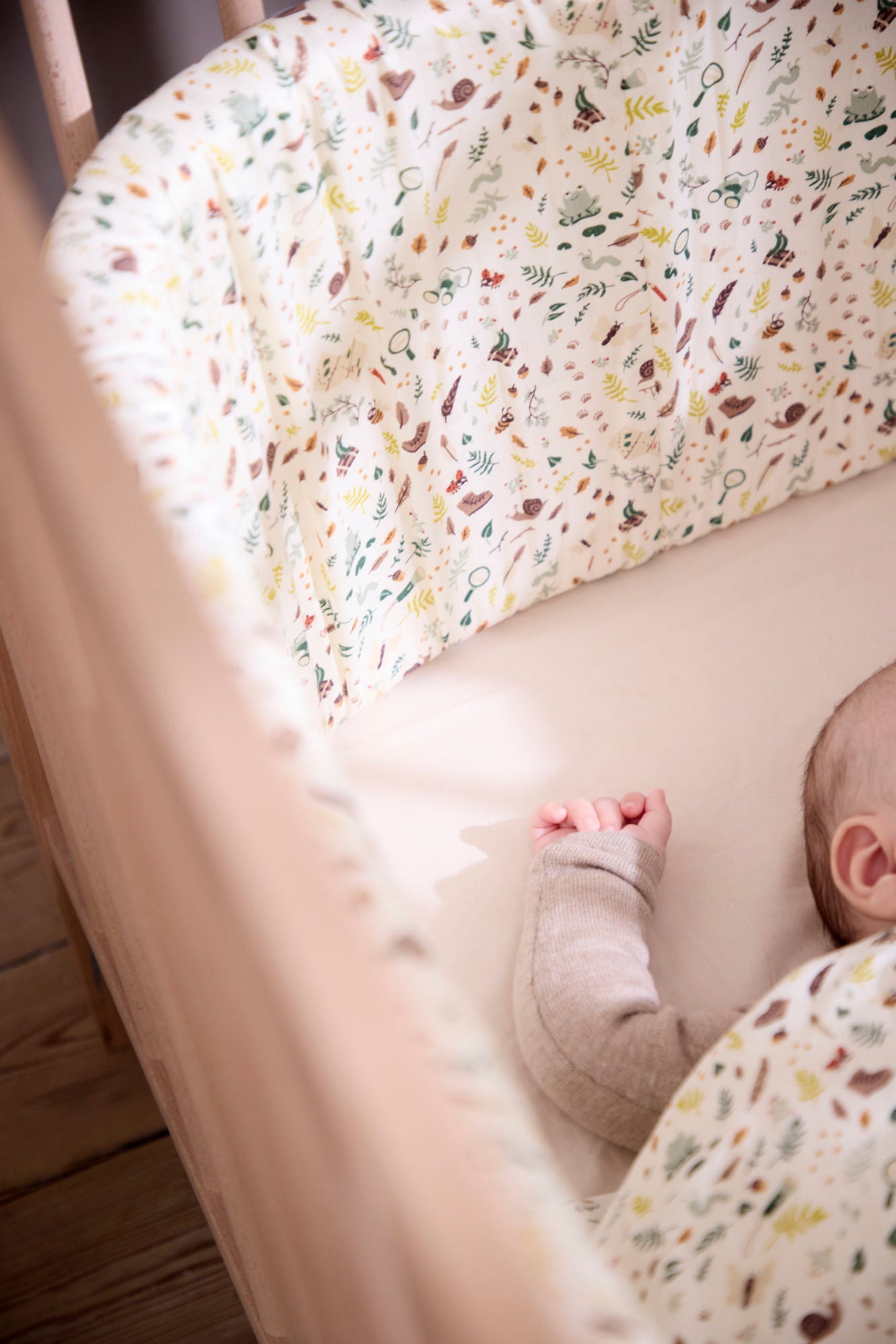 Sengeranden er fremstillet i 100% GOTS-certificeret økologisk bomuld og polstret med 4 cm koldpresset skum. Den er designet til at stå stabilt af sig selv, så du slipper for snore eller bånd. Den giver en tryg ramme omkring barnet og beskytter mod sengens hårde tremmer. Passer til både tremmesenge og vugger – i mindre senge kan enderne overlappes.