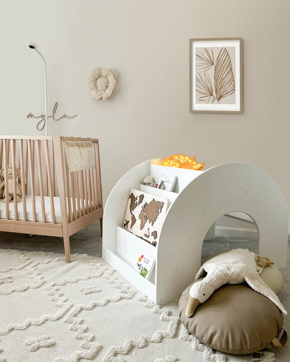 Reolens ene side har en lav, frontvendt bogreol, hvor barnet kan se og vælge sine yndlingsbøger selv. På den anden side af det lille “bjerg” findes et børnestørrelses arbejdsbord, perfekt til stille fordybelse, tegning eller puslespil. Midt i møblet er en hyggelig tunnel, som barnet kan kravle igennem – et legende element, der stimulerer både fantasi og bevægelse.