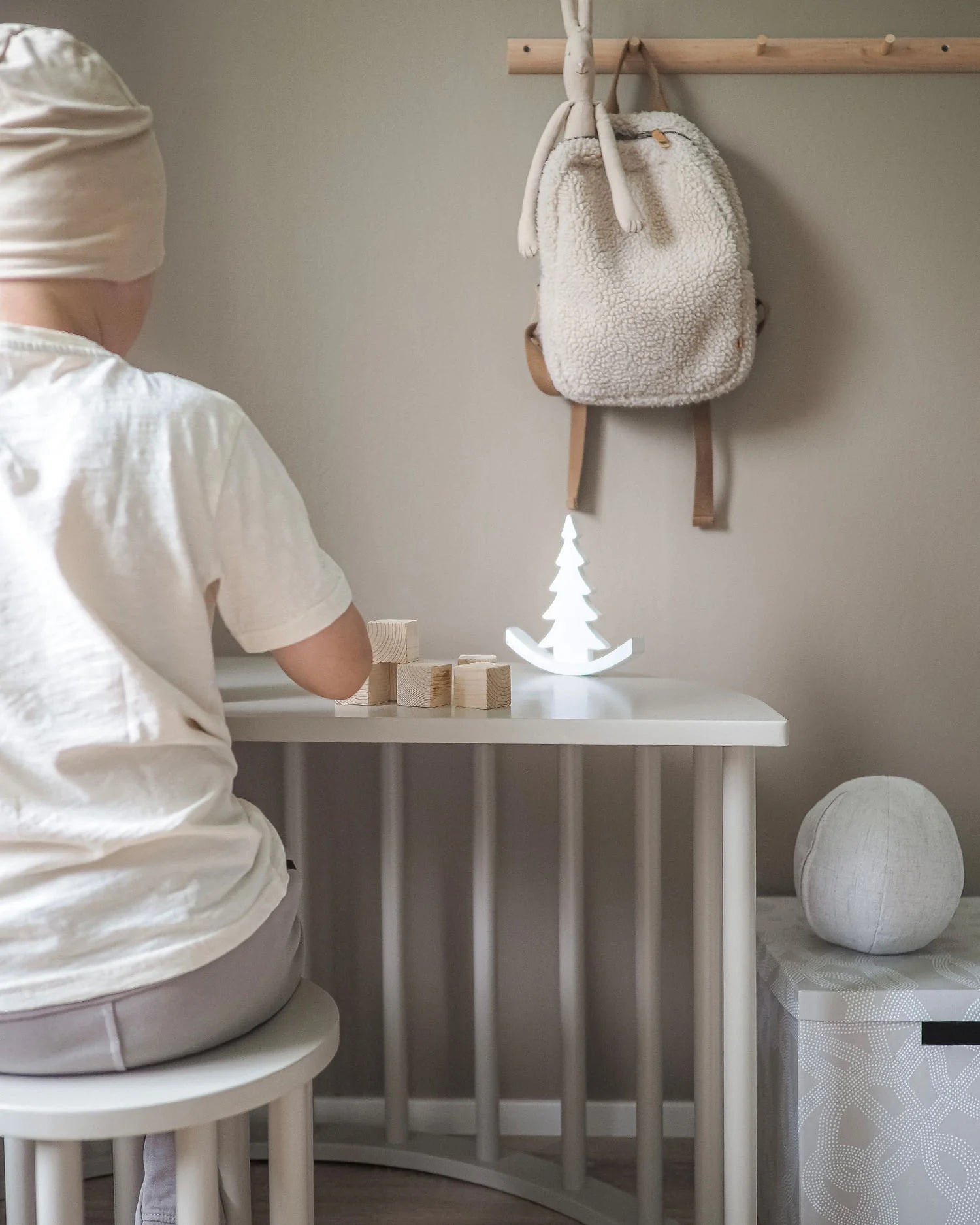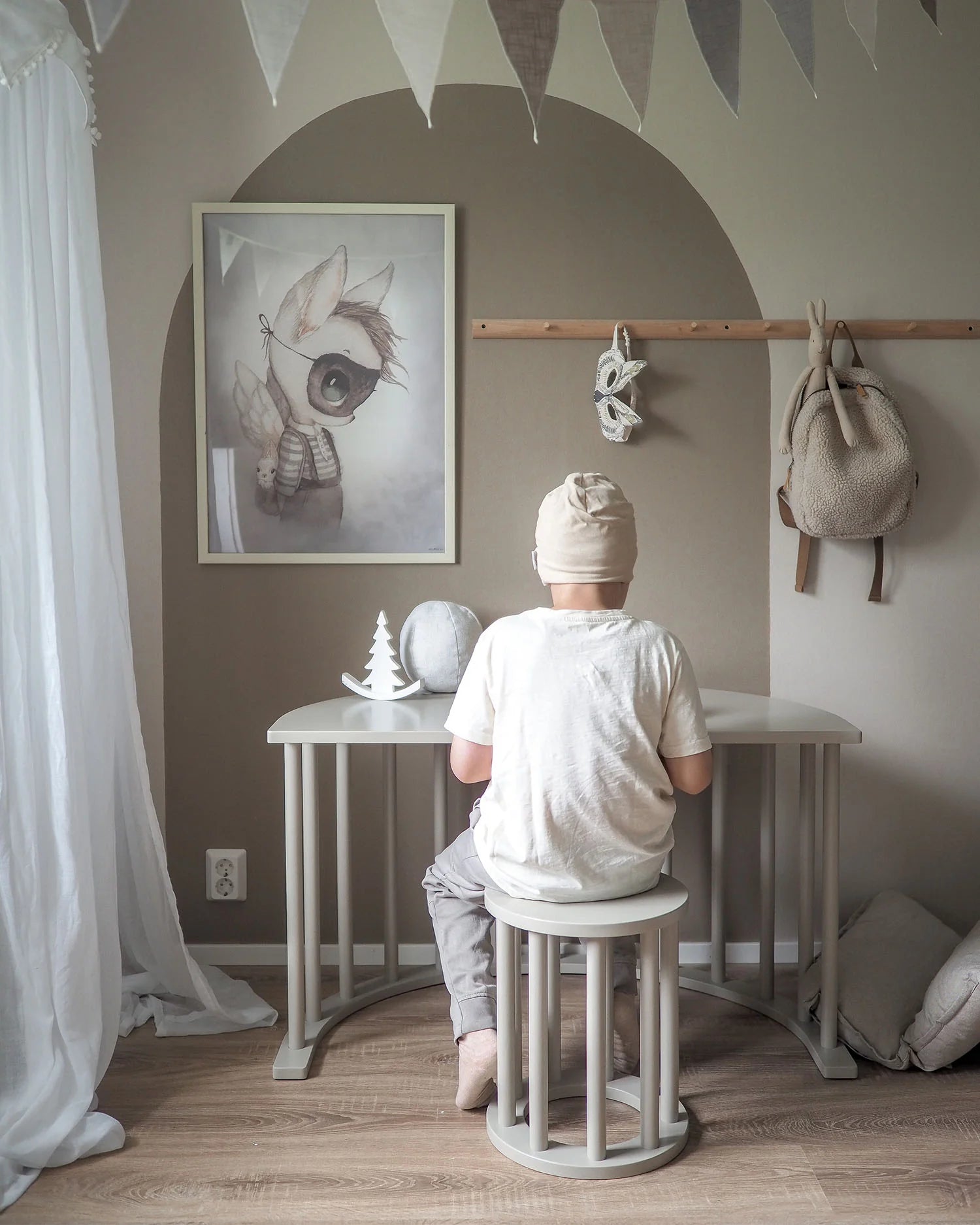 LUOTO II er designet til at understøtte barnets naturlige lyst til bevægelse og læring. Den styrker motorik, balance, koordination og selvtillid gennem aktiv leg – og kan bruges på mange måder: som klatrebue, gynge, legehule, mål, børnebord, opbevaringsmøbel eller endda som sidebord i hjemmet.