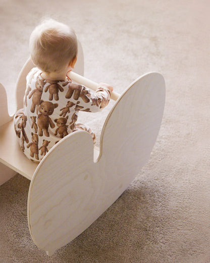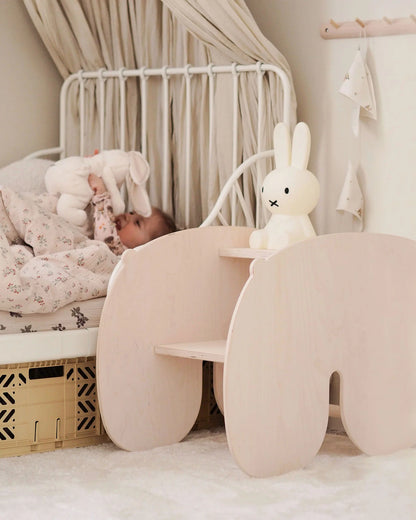 Som gyngehest styrker NUPPU barnets selvtillid, balance og kropskontrol, mens det lærer at regulere rytme og bevægelse. Vendt om bliver den et lille arbejdsbord, perfekt til kreative sysler som modellervoks, puslespil eller læsning. Et møbel, der vokser med barnet og forener leg og funktion på smukkeste vis.