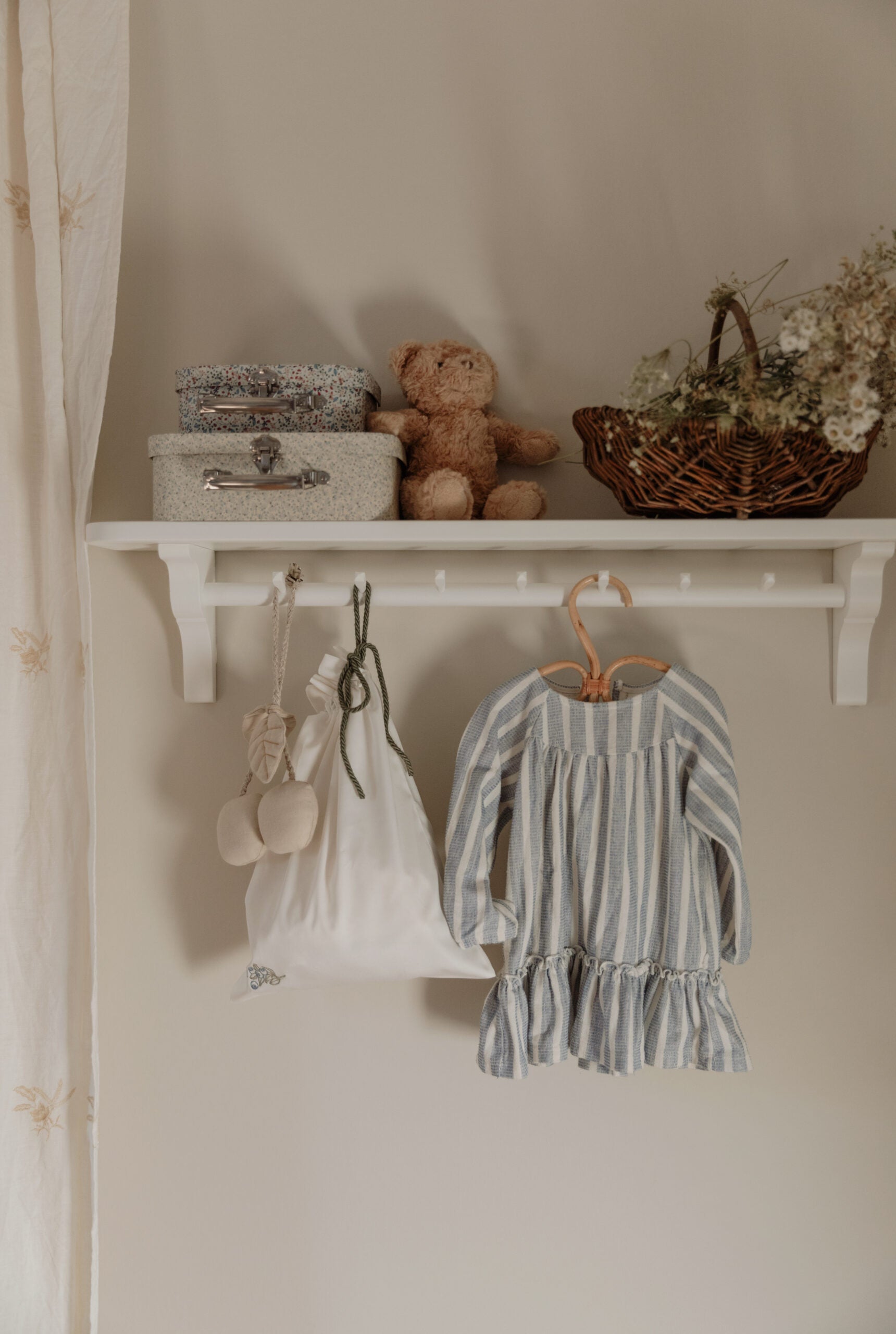 Den kraftige hylde med afrundede hjørner fungerer både som praktisk opbevaring og som afsætningsplads. Perfekt til huer, tasker og kurve – og i børneværelset også ideel til bøger, legetøj eller dekorative elementer.