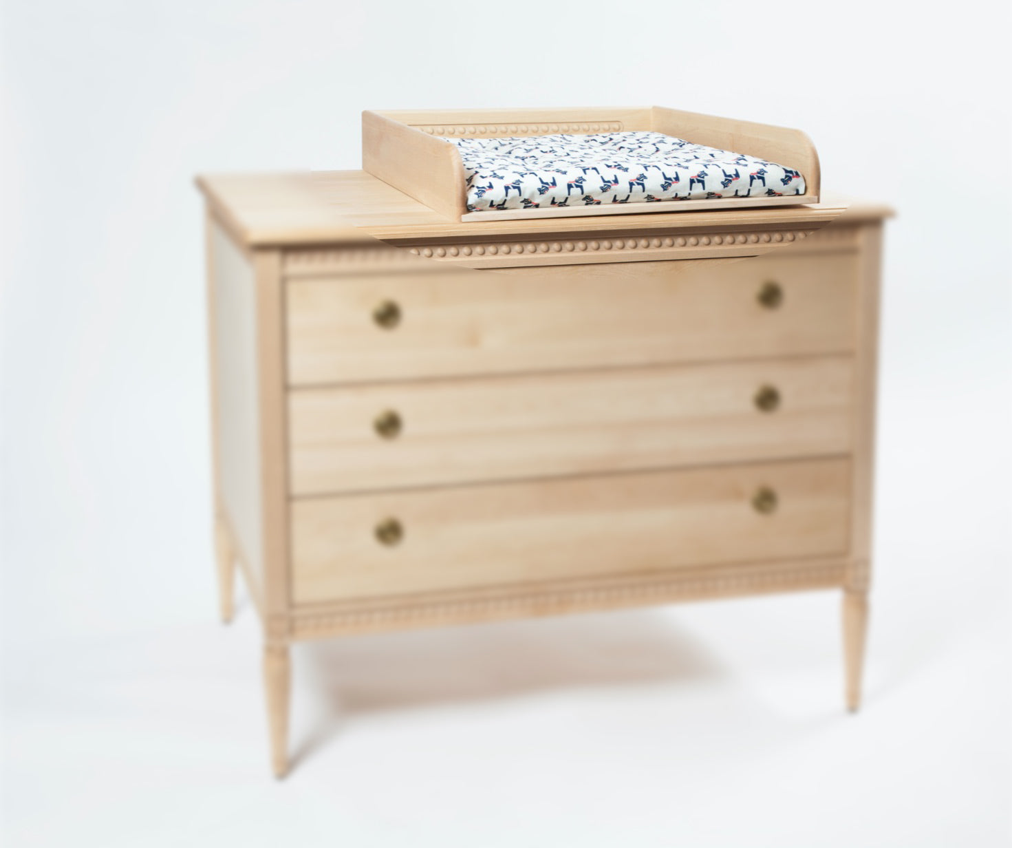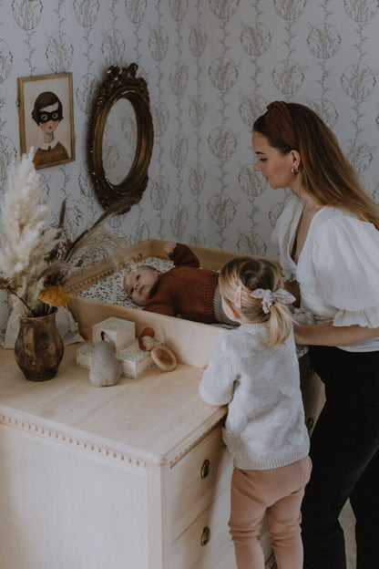Gustavienne pusleoverdelen i birk er en smuk og praktisk løsning, der gør det muligt at bruge Gustavienne kommoden som pusleplads i barnets første tid. Overdelen er fremstillet i massivt birketræ og har samme dybde som kommoden, så den passer præcist og stabilt ovenpå.