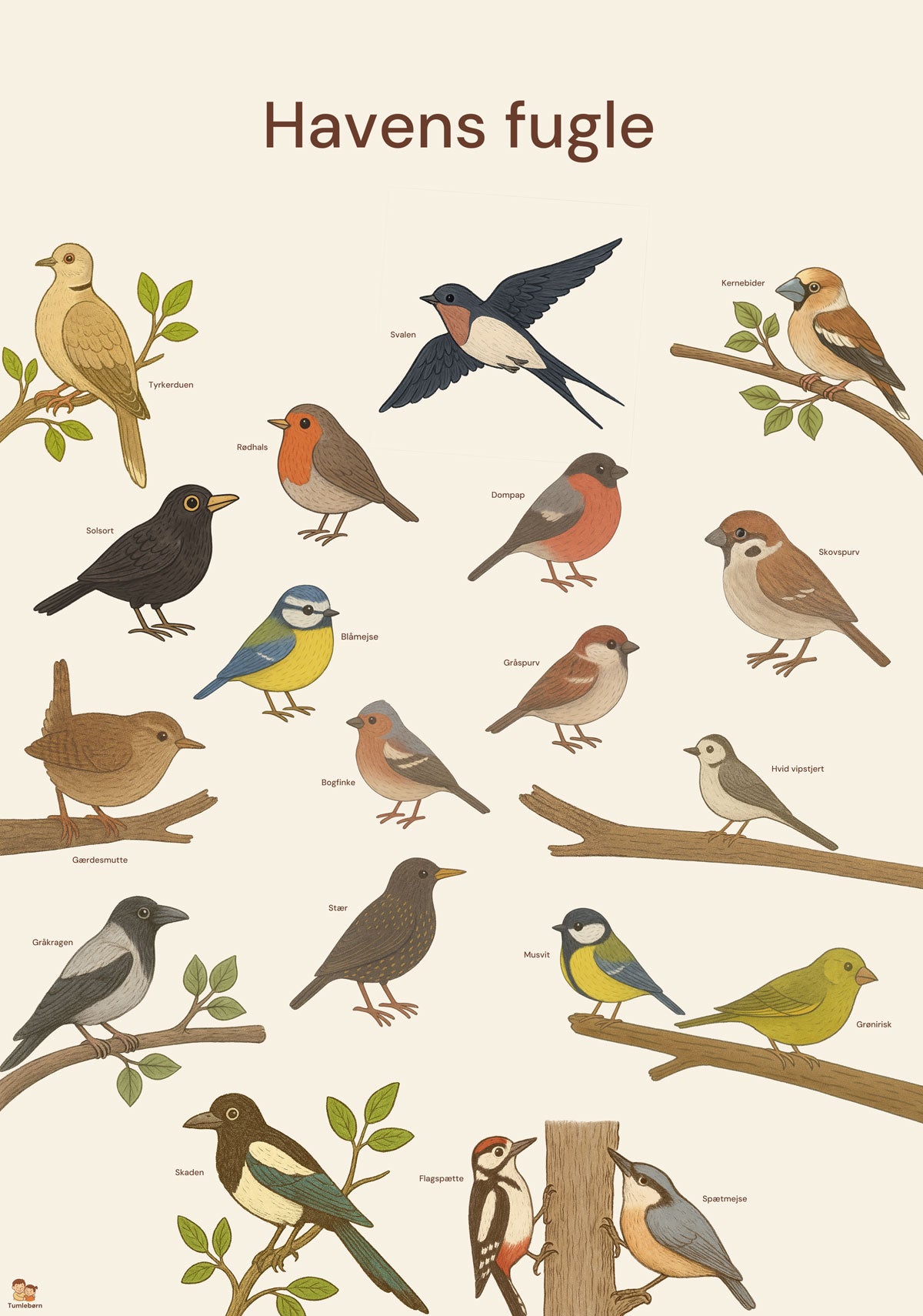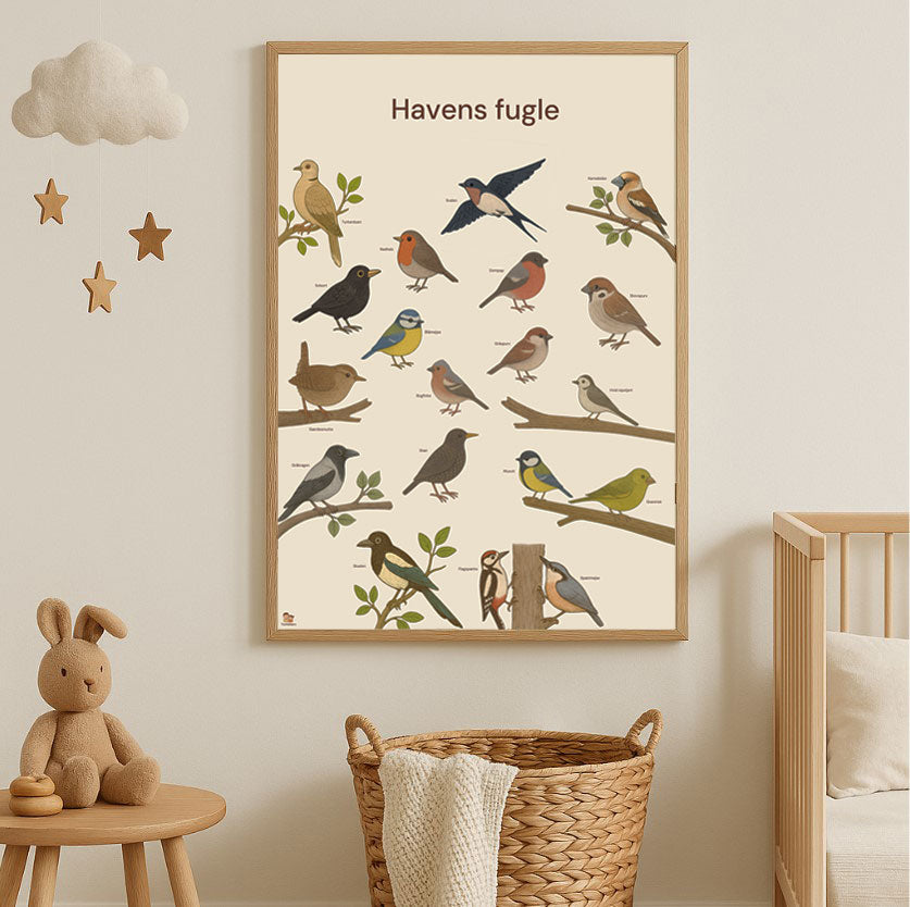 En håndtegnet plakat med 20 af de mest kendte fugle fra den danske have – skabt til at vække nysgerrighed og give ro i børneværelset.