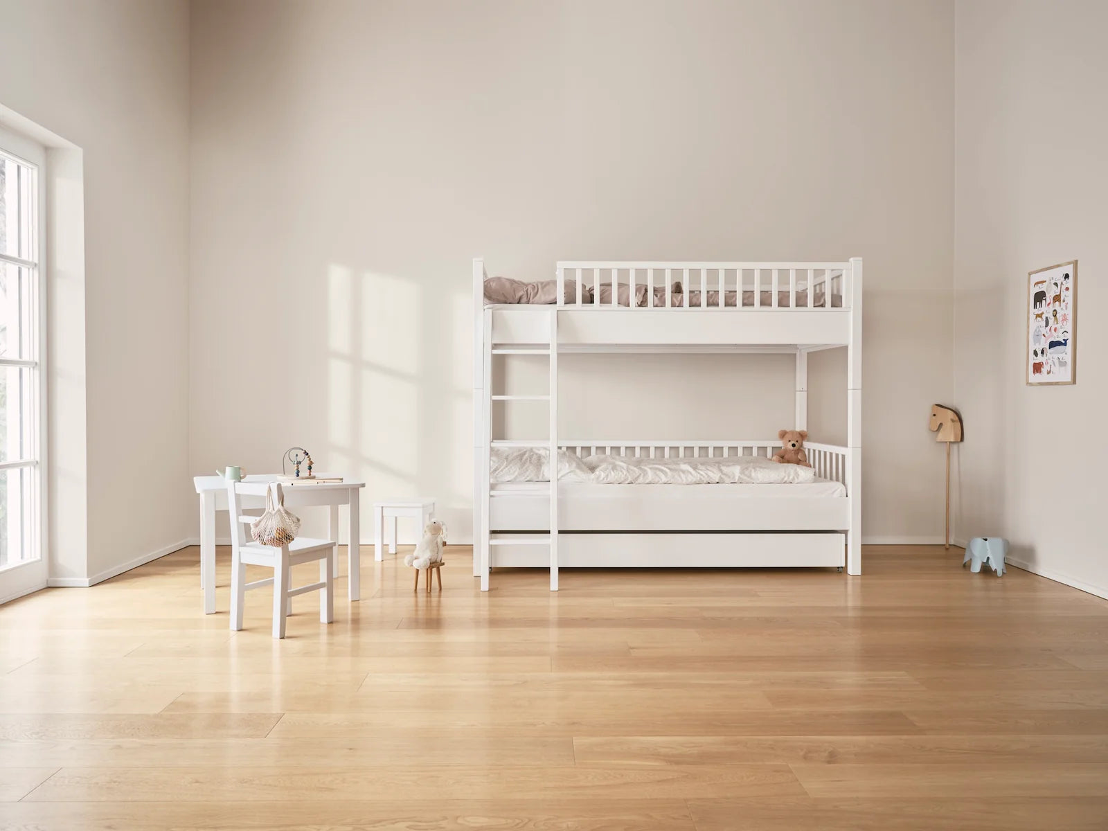 Køjesengen kan desuden ombygges til to separate sofasenge, hvis familiens behov ændrer sig. Det gør sengen til en fleksibel løsning, der kan tilpasses barnets alder og familiens hverdag over tid.