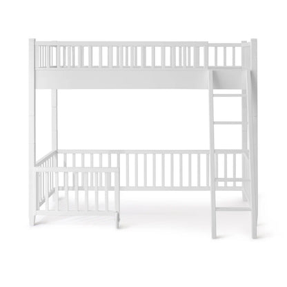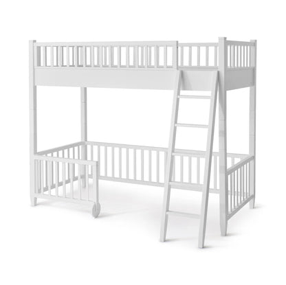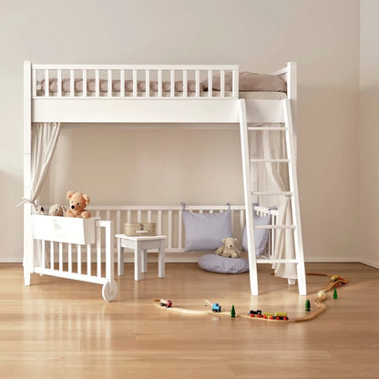 - Leveres som: legeseng, baldakinramme (uden tekstil), faldsikring, stige og drejelåge (kan monteres på begge sider)