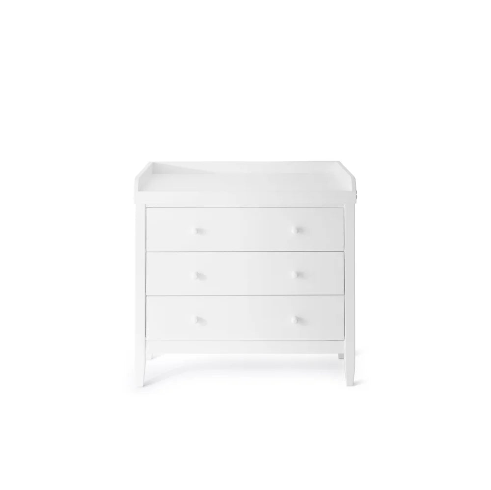 Kommoden er udstyret med rummelige skuffer, der giver god plads til bleer, tøj og hverdagens nødvendigheder. Den solide konstruktion og de afrundede kanter sikrer en tryg og stabil puslesituation for både barn og forælder.