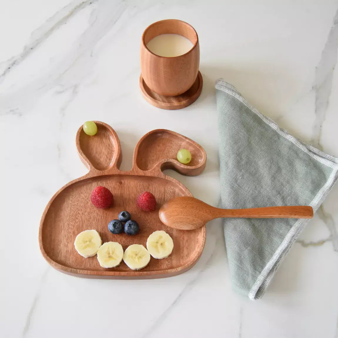 Khayatræ – også kaldet afrikansk mahogni – er et smukt og slidstærkt naturmateriale med varme, rødbrune toner. Det er kendt for sin fine årestruktur og holdbarhed, og derfor særligt velegnet til børneservice. Træet stammer fra bæredygtigt skovbrug og forarbejdes nænsomt, så hvert produkt bevarer sin unikke glød og struktur. Et trygt og naturligt valg til små hænder og store måltider.