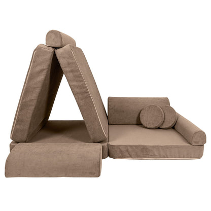 MeowBabys modulsofa i brun Slimcord-fløjl forener blød komfort med et moderne og funktionelt design. Den består af flere moduler, som nemt kan flyttes rundt og sammensættes til sofaer, tunneller, huler eller egne fantasifulde konstruktioner. Den smalle fløjlsstruktur giver sofaen et elegant udtryk, mens det stabile og bløde skum sikrer tryg og behagelig brug for børn fra 2 år og op.