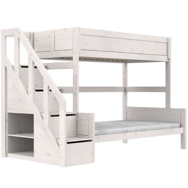 LIFETIME Kidsrooms familiekøjeseng med trappe i hvidpigmenteret fyrretræ er en smuk og gennemtænkt løsning til familier, der ønsker ekstra plads, funktionalitet og et mere naturligt træudtryk samlet i én seng. Her får I både tryghed, fleksibilitet og praktisk opbevaring i børnehøjde.