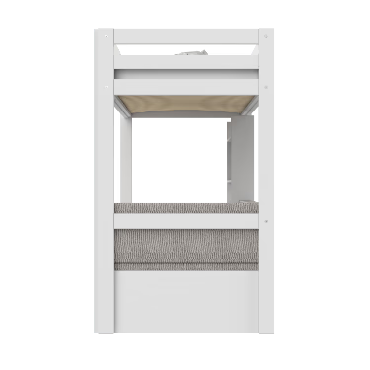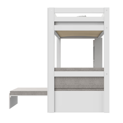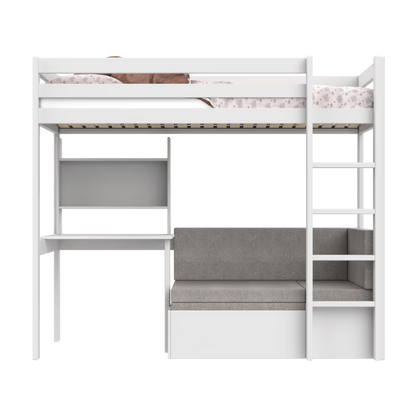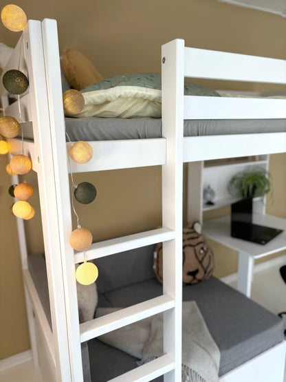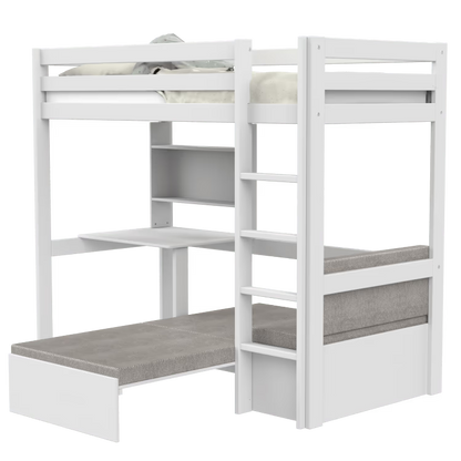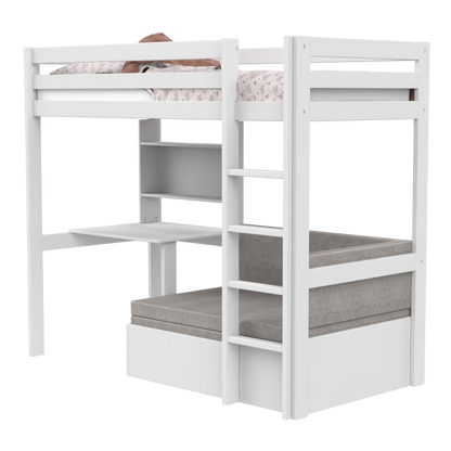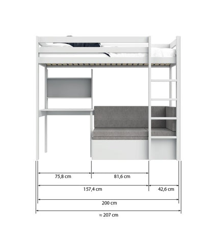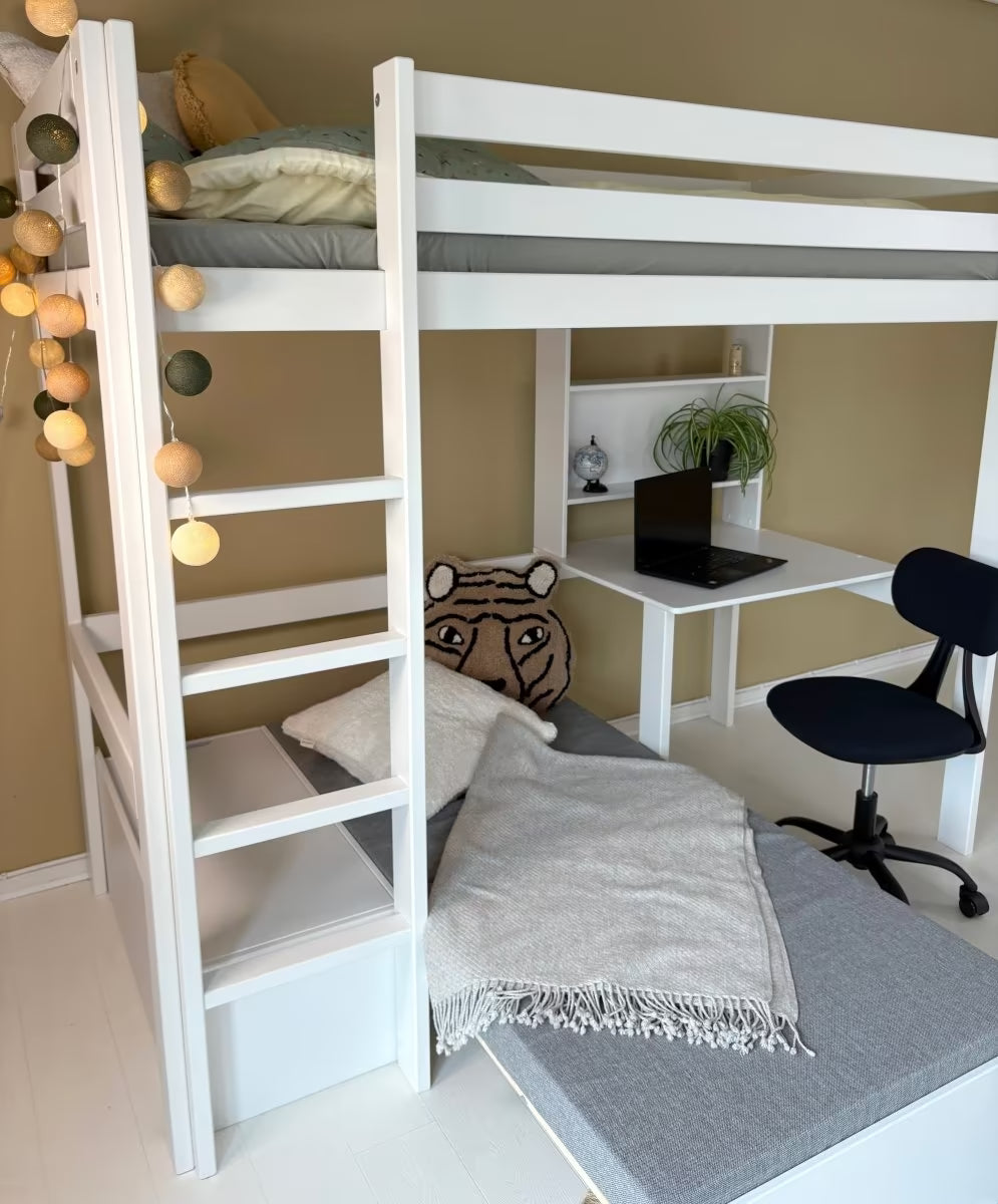 Med sengen placeret i højden frigives et stort område nedenunder, hvor det integrerede skrivebord giver en fast og rolig base til lektier, kreative projekter og hobbyer. Ved siden af finder I en hyggelig sofakrog med udtræksfunktion, som nemt forvandles til en komfortabel gæsteseng.