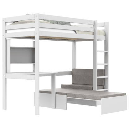 En gennemtænkt alt-i-en-løsning til børn, der har brug for plads til både søvn, fordybelse og afslapning. Denne højseng er en del af Elements-kollektionen og kombinerer seng, skrivebord og sovesofa i ét møbel – perfekt til det moderne børneværelse.