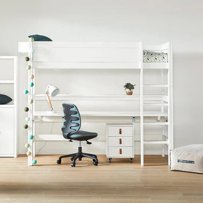Pladsen under sengen udnyttes i hele sengens længde, hvilket giver mulighed for et skrivebord med god bordplads, hylder til bøger eller anden praktisk opbevaring. En løsning, der passer godt til både skolebørn og større børn, som har brug for et fast sted til fordybelse.