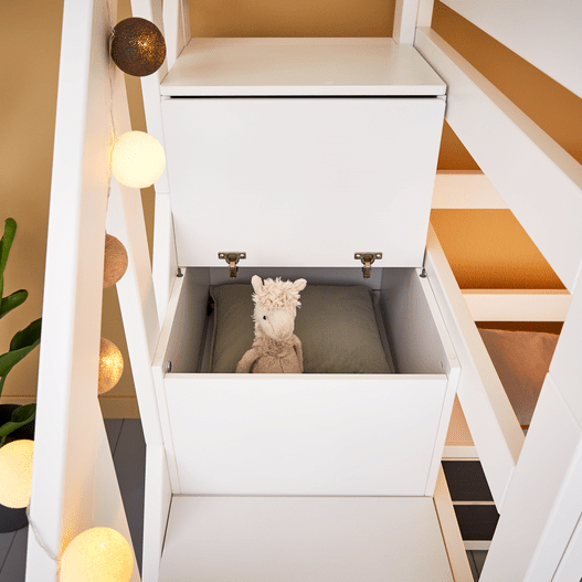 Sengen er udstyret med en praktisk trappe med indbygget opbevaring i hvert trin, så legetøj, bøger eller nattens små skatte altid er lige ved hånden. Trappen kan monteres både i højre og venstre side, hvilket giver fleksibilitet, når værelset skal indrettes.
