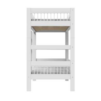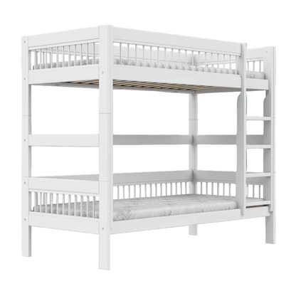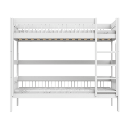Den lige stige fylder minimalt i rummet og kan monteres i både venstre og højre side, så sengen nemt kan tilpasses indretningen. Med god højde mellem de to senge får barnet i den nederste køje luft og plads, mens den øverste køje stadig føles tryg og overskuelig.