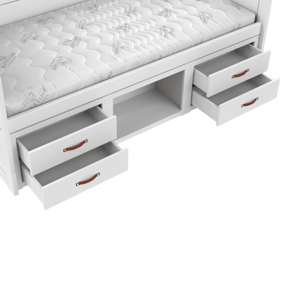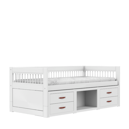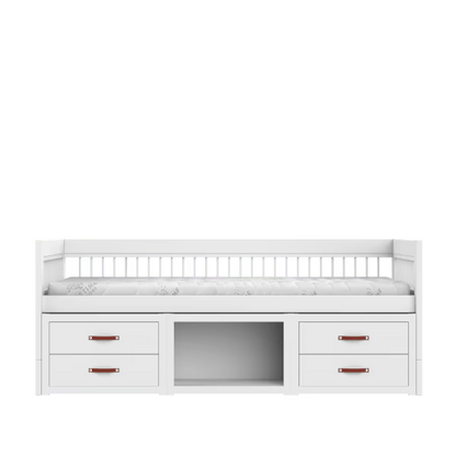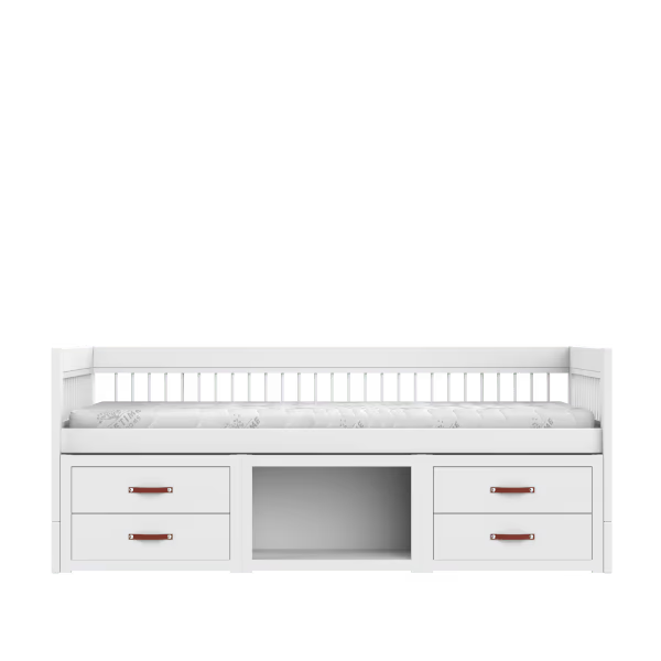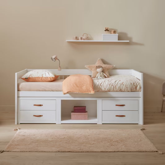 LIFETIME Kidsrooms multi børneseng i hvid er en funktionel og gennemtænkt løsning, hvor seng og opbevaring er samlet i ét møbel. Sengen leveres med to sæt rummelige skuffer og en lav reol, som giver god plads til legetøj, bøger og tøj – alt sammen let tilgængeligt i barnets højde.