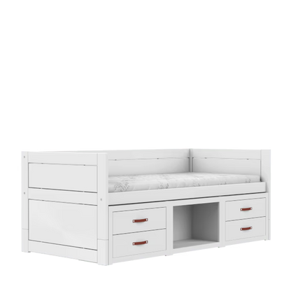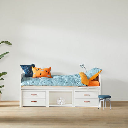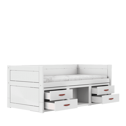 LIFETIME Kidsrooms multi børneseng i hvid er en praktisk og gennemtænkt løsning, hvor søvn og opbevaring går hånd i hånd. Sengen leveres med to sæt rummelige skuffer og en lav reol, som tilsammen giver god plads til legetøj, tøj og hverdagens småting – uden at gå på kompromis med et roligt og enkelt udtryk.