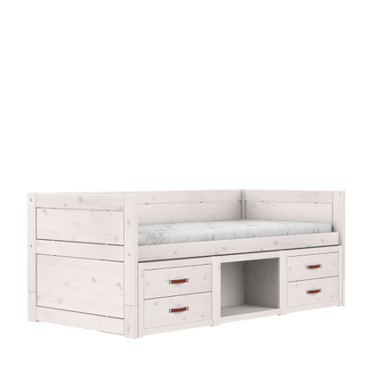 LIFETIME Kidsrooms multi børneseng i hvidpigmenteret fyrretræ kombinerer søvn og opbevaring i ét roligt og funktionelt møbel. Sengen leveres med to sæt rummelige skuffer og en lav reol, som giver god plads til legetøj, tøj og hverdagens småting – alt sammen i børnehøjde.