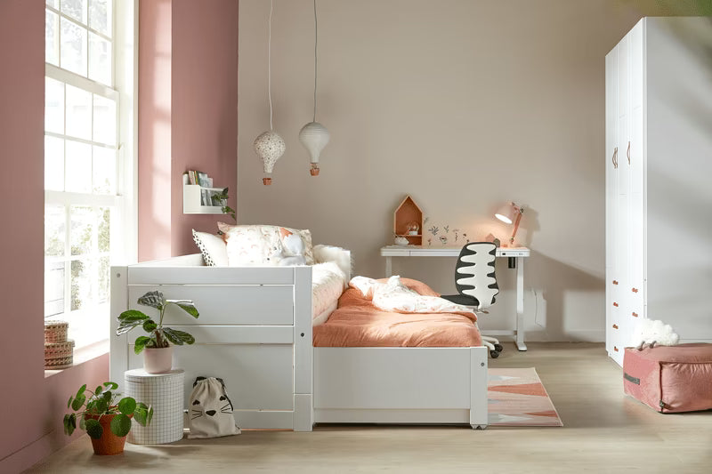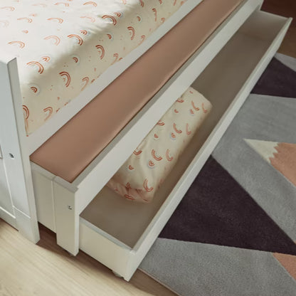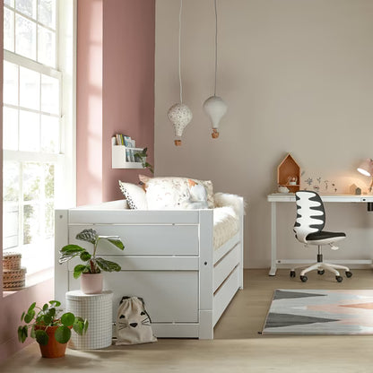 Sengeskuffen under gæstesengen kan bruges som praktisk opbevaring til sengetøj, legetøj eller tøj – eller som endnu en ekstra soveplads, hvis behovet opstår. En fleksibel løsning, der passer godt til hverdagen i en børnefamilie.