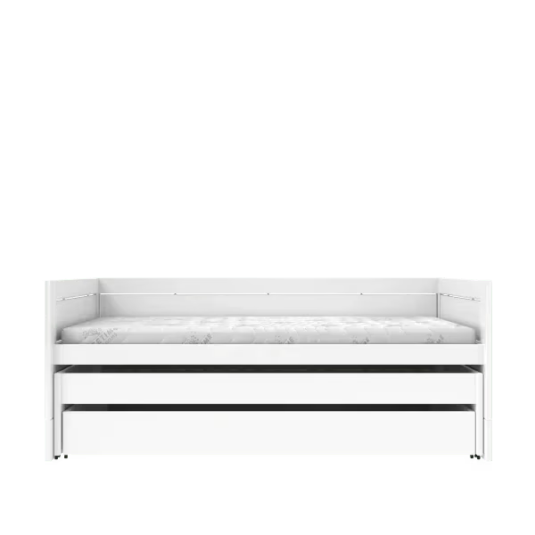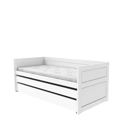 Den forudkonfigurerede kombination består af multisengen, en udtrækbar gæsteseng og en ekstra sengeskuffe. Gæstesengen kan nemt trækkes ud, når der er brug for en ekstra soveplads – perfekt til overnattende venner eller søskende. Den ligger en smule lavere end hovedsengen og udnytter pladsen under sengen optimalt.