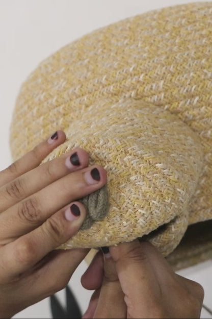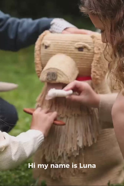 Luna er skabt med masser af fine, håndlavede detaljer, som gør den både levende og sjov at bruge. De bløde ører med foer, de håndknyttede øjne med små bryn og den interaktive snude med en tunge, der kan rulles ud, gør kurven til meget mere end bare opbevaring. Den bevægelige mund og det lille legetøjsben, der følger med, inviterer til leg – mens den røde halsbåndsdetalje fuldender det varme udtryk.