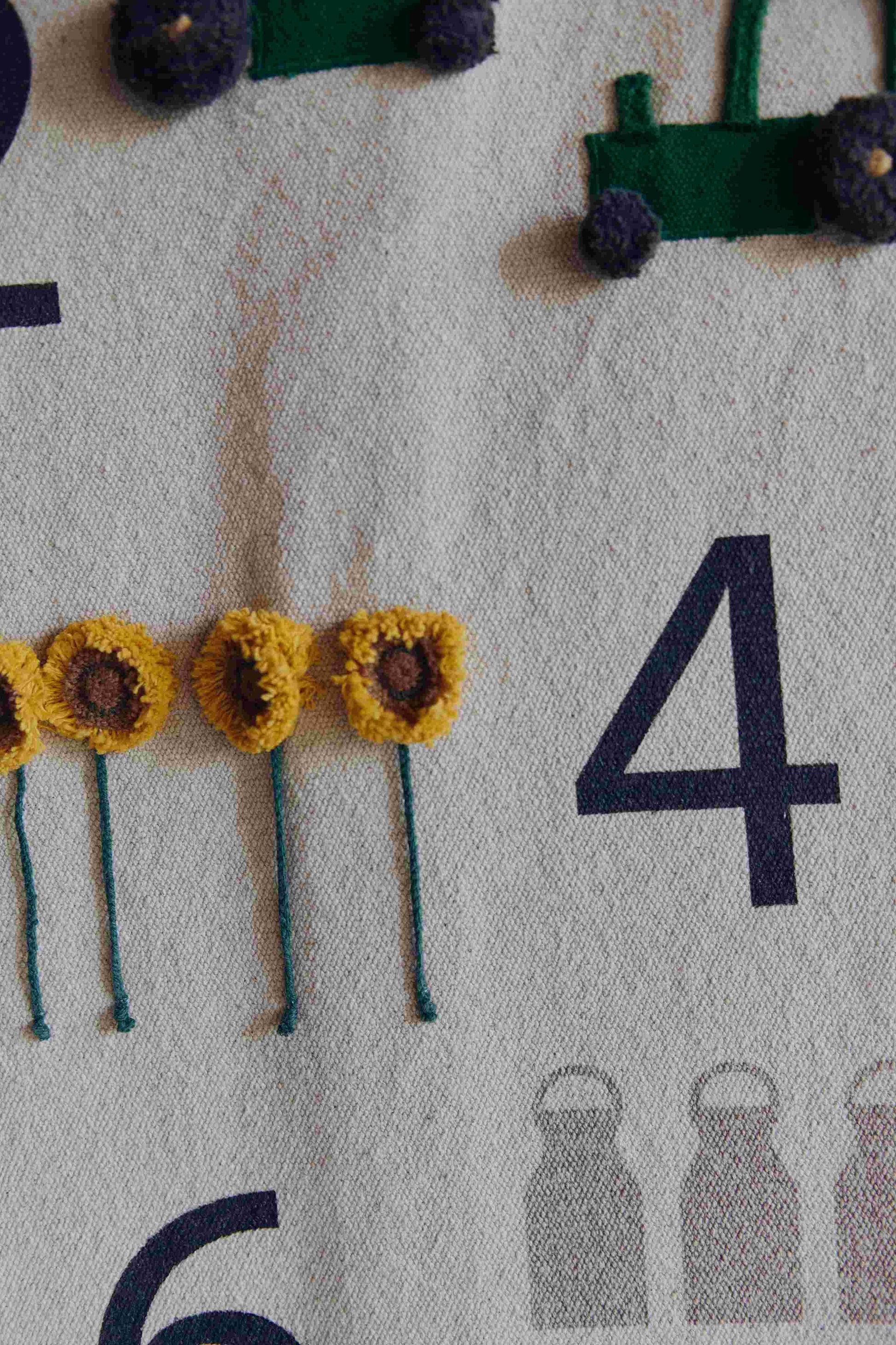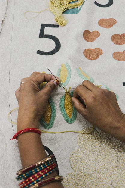 De håndlavede detaljer springer ud fra lærredet med tekstiler, snore og frynser, som giver dybde og taktil oplevelse. Kombinationen af broderi, print, håndlavede pomponer, specialfarvede snore og små æg giver ophænget det karakteristiske Lorena Canals-udtryk og gør hvert stykke helt unikt.