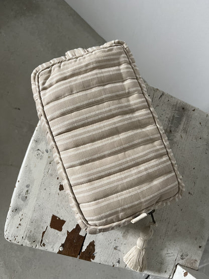 Pine Cone Lulu toilettaske i Beige Stripe er både praktisk og smuk. Tasken er quiltet og coated indvendigt, så stoffet er beskyttet og bliver både smuds- og vandafvisende. Indvendigt finder du det fine Natura Dot-print samt lommer, der gør det nemt at organisere alt fra småpleje til rejseudstyr.