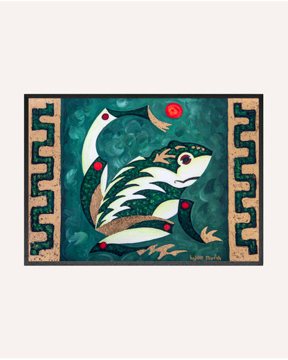 Fyld børneværelset med leg og fantasi med dette finurlige kunstværk af Lykke Mørch. Maleriet forestiller en livlig frø, der leger med en bold – et motiv, der fanger børns nysgerrighed og får smilet frem. En plakat, der både skaber glæde og åbner for sjove fortællinger om dyrenes verden.