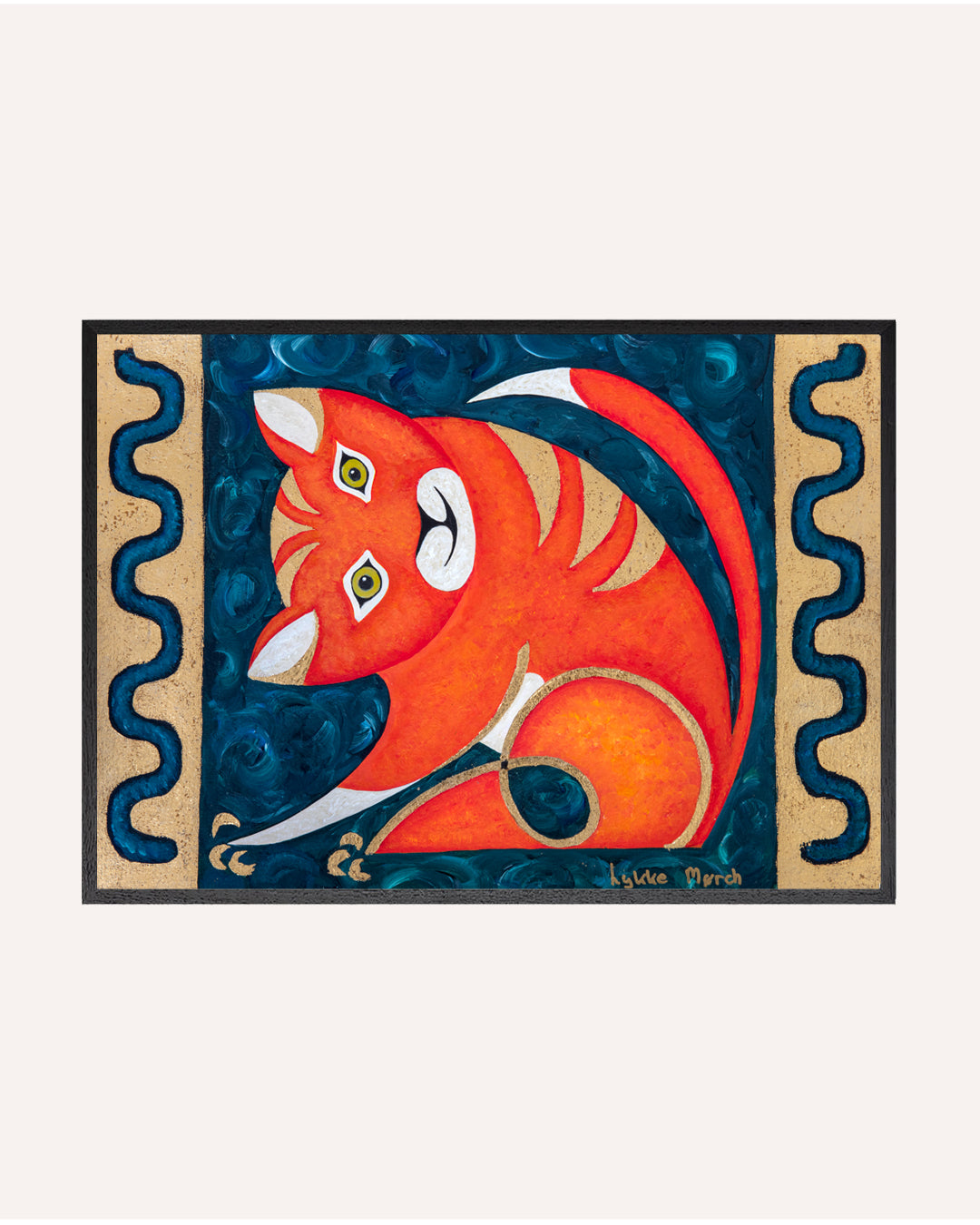 Giv børneværelset et strejf af mystik og leg med dette kunstværk af Lykke Mørch. Maleriet forestiller et elegant kattedyr, der balancerer mellem det vilde og det tamme – et motiv der både kan vække børns fantasi og skabe en rolig atmosfære. Et værk, der inviterer til historier om dyr, eventyr og drømmeverdener.