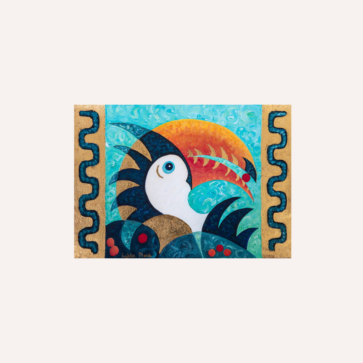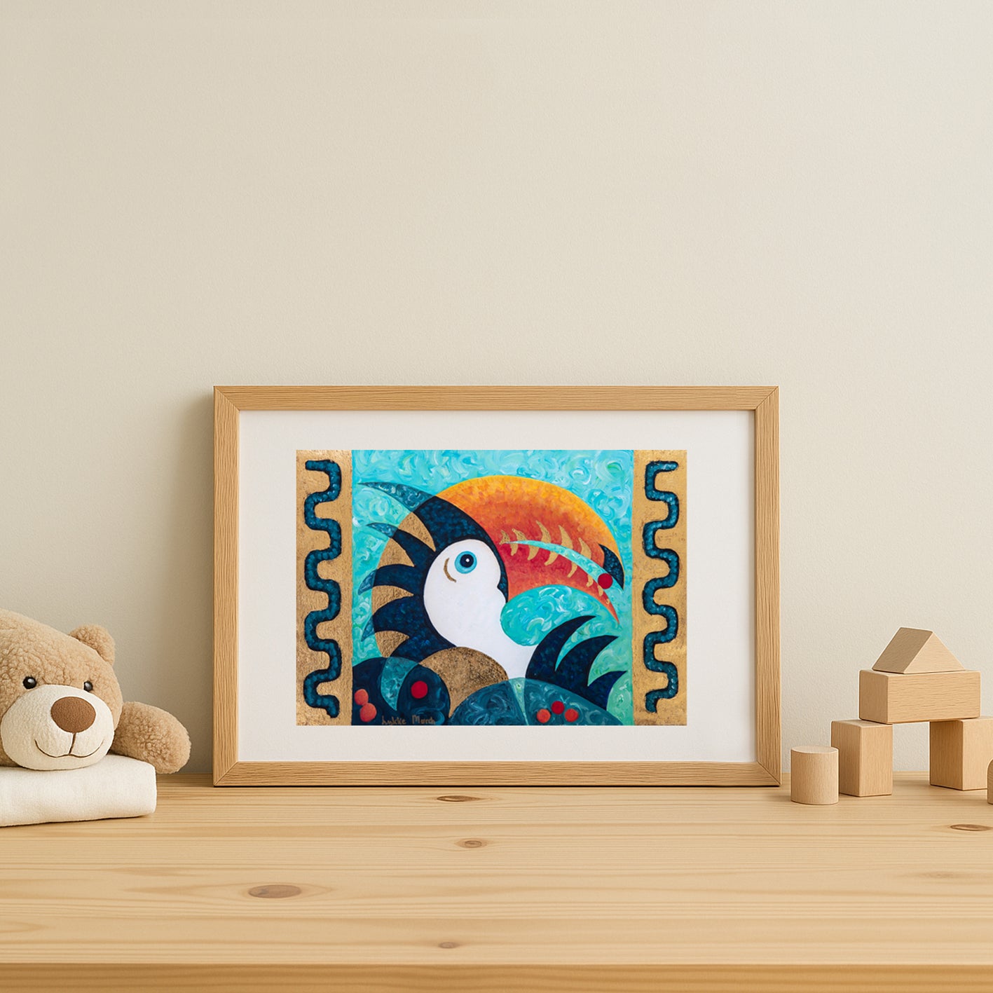 Skab en eksotisk stemning på børneværelset med dette farverige kunstværk af Lykke Mørch. Maleriet forestiller en livlig tukan med sit karakteristiske næb – et motiv, der vækker nysgerrighed og bringer tropiske toner ind i rummet. Perfekt til børn, der elsker dyr og eventyr.