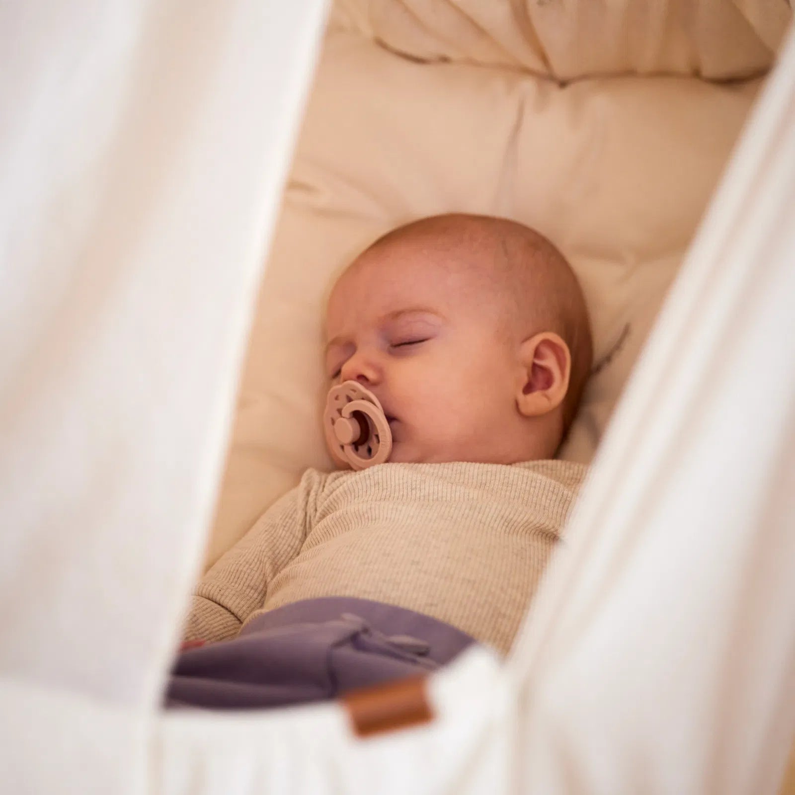 Baldakinen passer perfekt til Membantu Premium slyngevugge og er nem at montere. Den giver en blød afskærmning, som mindsker visuelle og auditive stimuli, uden at gå på kompromis med ventilationen. Stoffet kan nemt trækkes lidt til siden, så der altid sikres frisk luft omkring barnet.