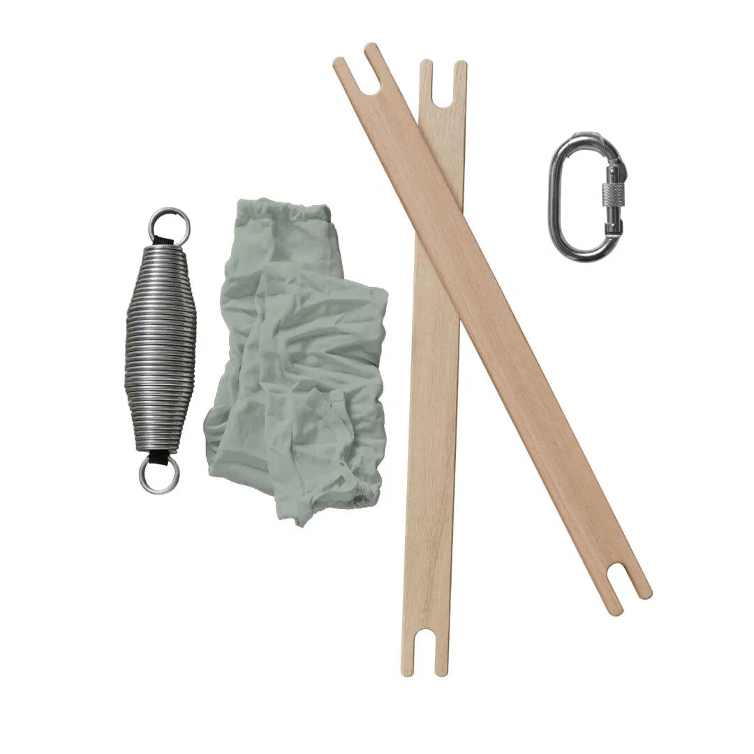 Sættet er lavet med tværpinde i egetræ og et fjederbetræk i økologisk bomuld, hvilket kombinerer funktionalitet med naturlige materialer. Det giver en både sikker og praktisk løsning, der forlænger brugen af din tvillinge-slyngevugge.