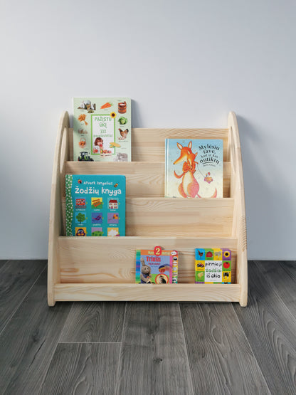Reolen er fremstillet af massivt birketræ og har afrundede hjørner for maksimal sikkerhed. Frontdisplayet præsenterer bøgerne med forsiden udad, så barnet tydeligt kan se og vælge, mens den bageste del rummer ekstra bøger eller legetøj.