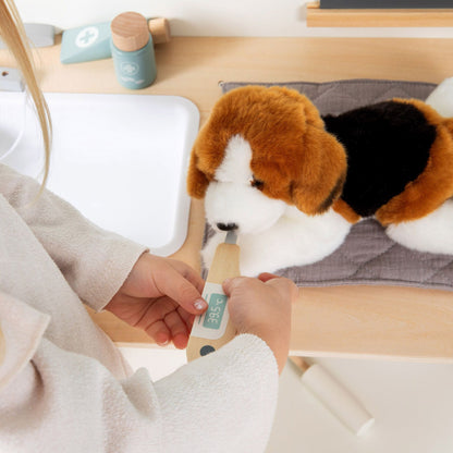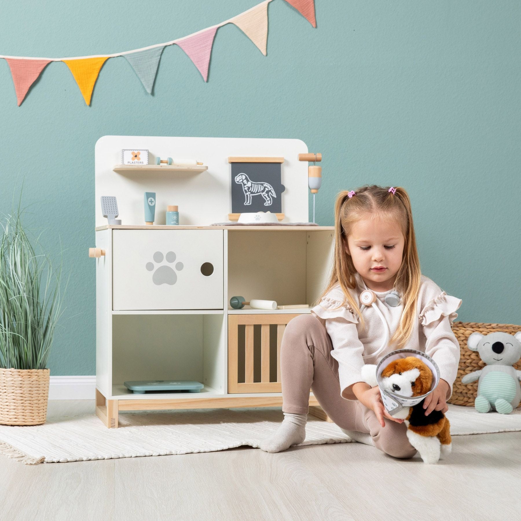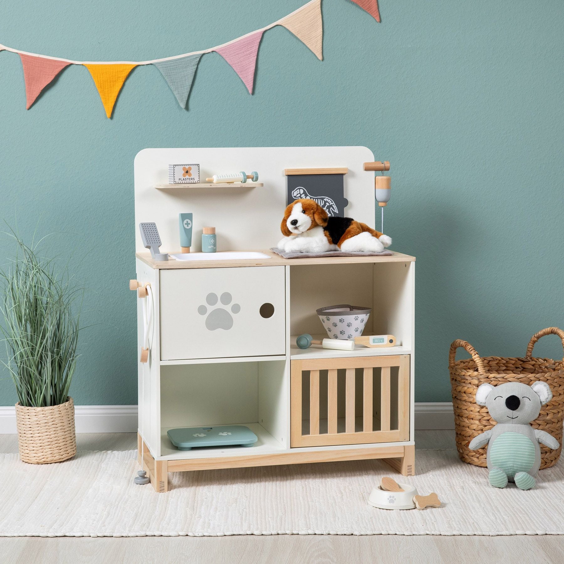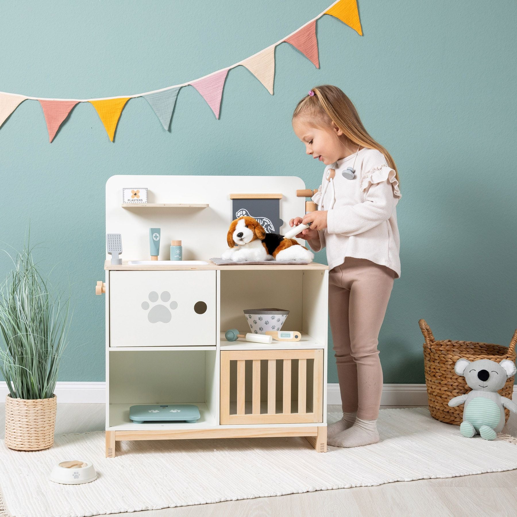 MUSTERKIND Thymus dyrlægeklinik giver børn mulighed for at lege omsorgsfulde dyrlæger i et realistisk og smukt designet miljø. Fremstillet i FSC®-certificeret træ og muslinstof, kombinerer klinikken funktion, æstetik og leg på den mest charmerende måde – perfekt til små dyrevenner med stor fantasi.