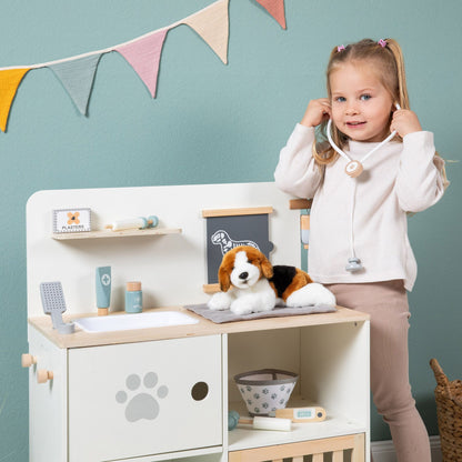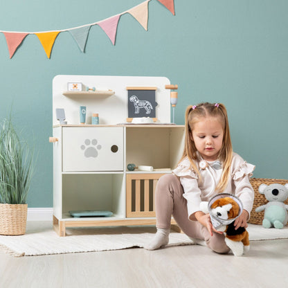 - Plads til mange dyr: Med åbne rum, lukkede skabe og et stort opbevaringsrum kan børn let organisere deres “patienter” og udstyr.