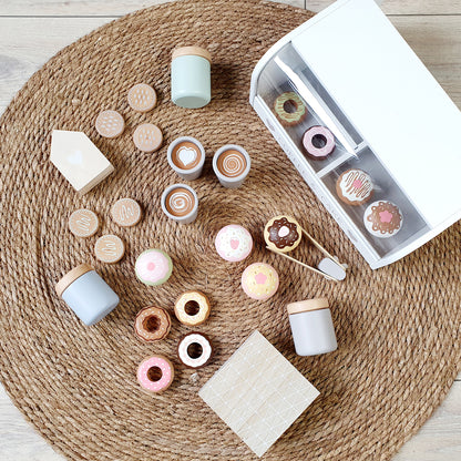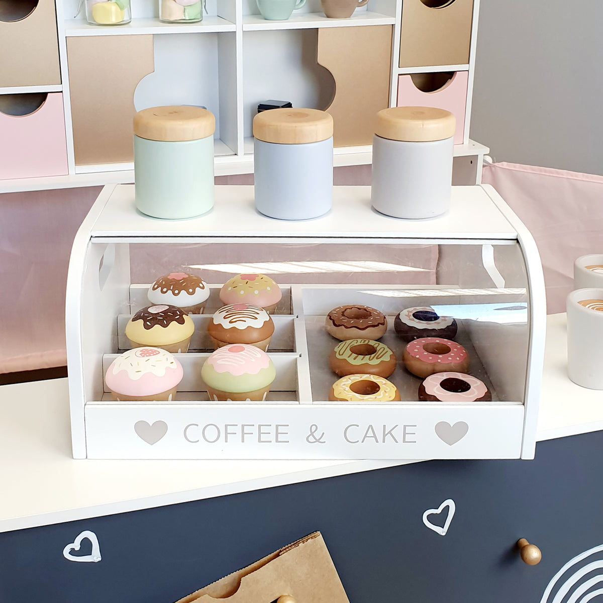 MUSTERKIND Vanilla kaffe- og kageboks er et charmerende trælegetøj, der kombinerer leg, læring og kreativitet – perfekt som tilbehør til legekøkkenet eller legebutikken.
