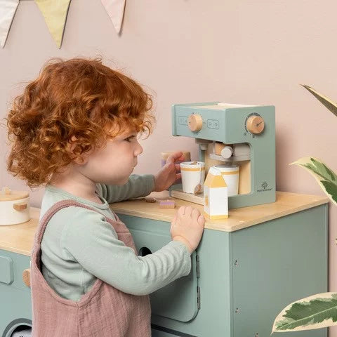 Kaffe eller te? Med MUSTERKIND Coffea kaffemaskine i salviegrøn og natur kan små baristaer servere varme drikke med stil. Denne smukt designede trækaffemaskine er et perfekt supplement til legekøkkenet – med realistiske detaljer og alt, hvad der hører til en hyggelig kaffepause.