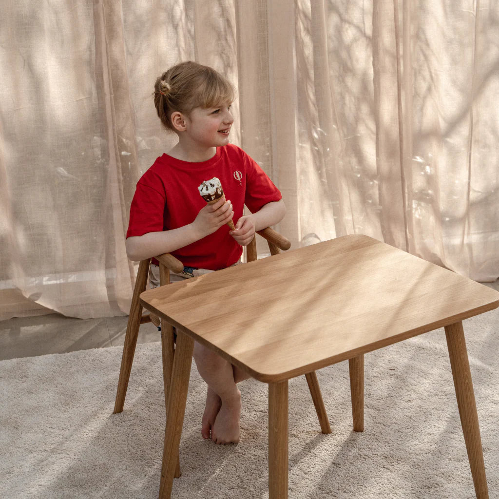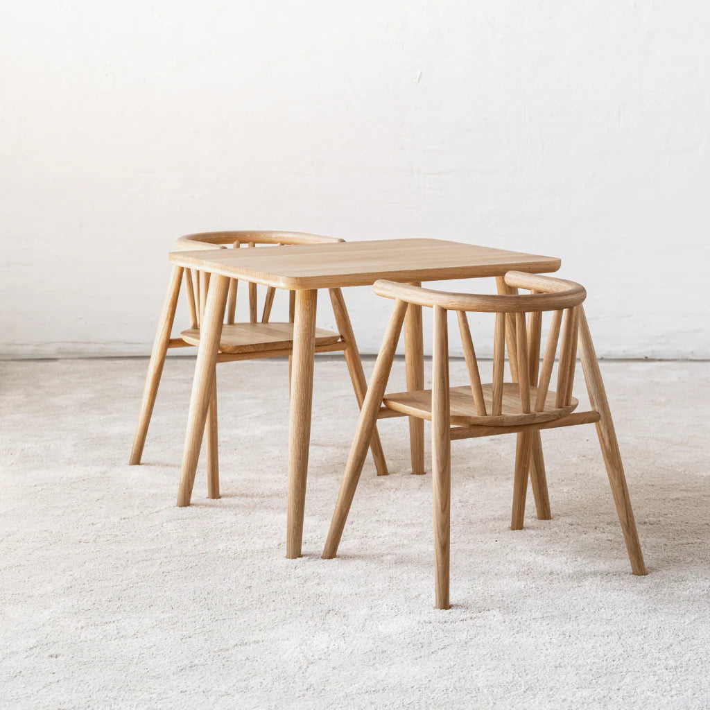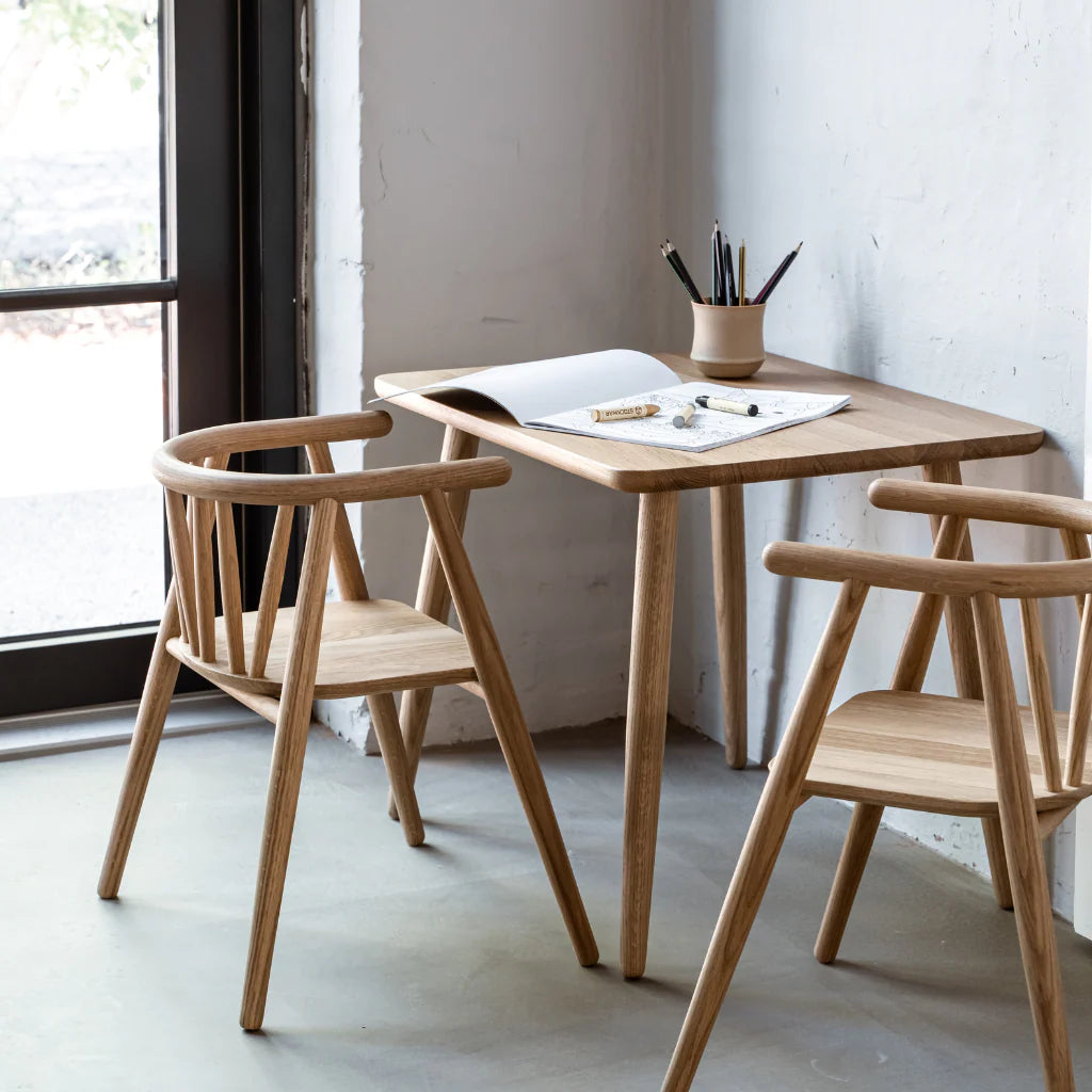 Oaklings Asta børnebord i eg er designet af Nina Bruun i 2023 og skabt som det perfekte supplement til Storm børnestolen. De karakteristiske former fra stolens ben går igen i bordets design, hvilket giver et elegant og harmonisk sæt, der passer naturligt ind i hjemmets indretning.
