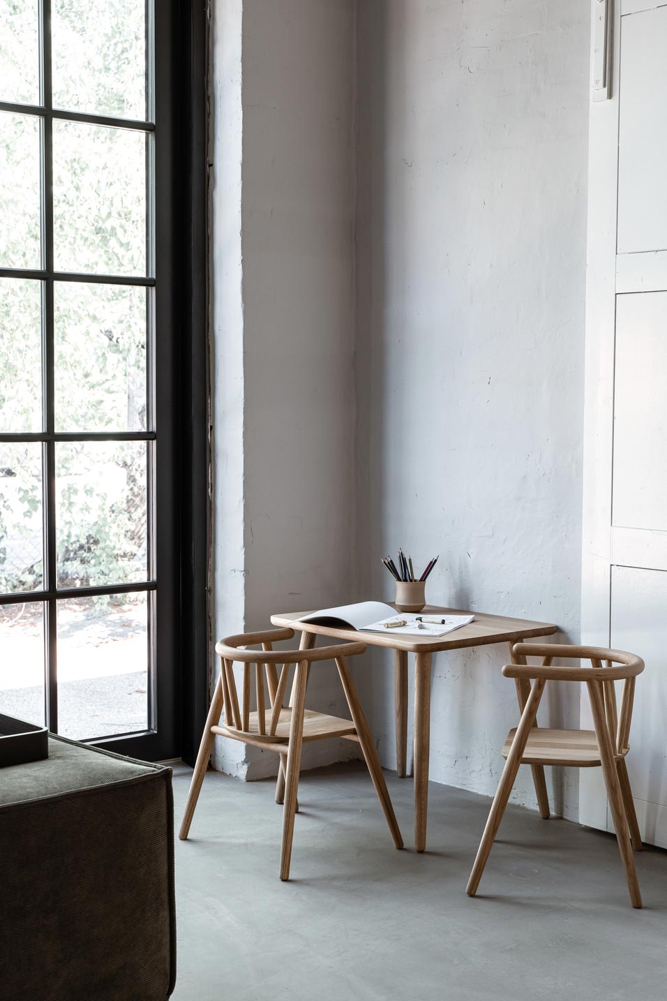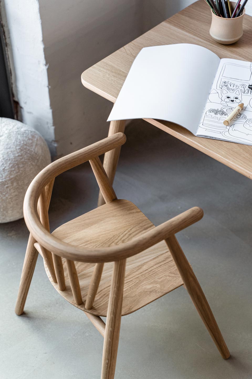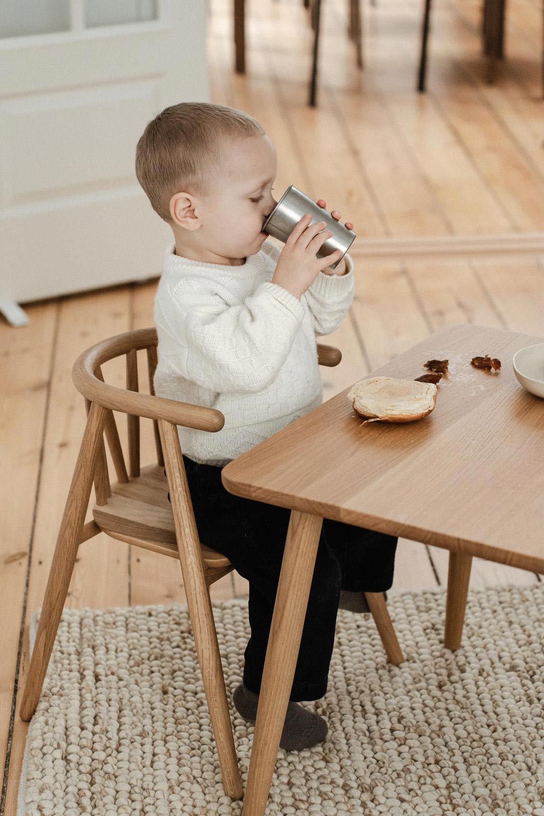 Som ved Oaklings øvrige møbler bærer Asta børnebordet et diskret laserskåret logo på undersiden med produktionstidspunktet – en detalje, der understreger kvaliteten og den lange levetid. Kombinationen af Asta bordet og Storm børnestolen giver barnet en komfortabel plads til leg, tegning og spisning, samtidig med at designet harmonerer smukt med hjemmets æstetik.