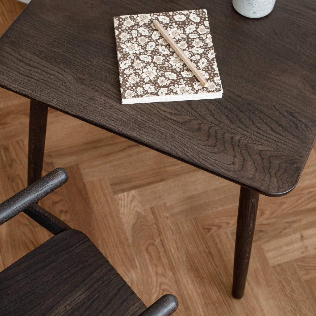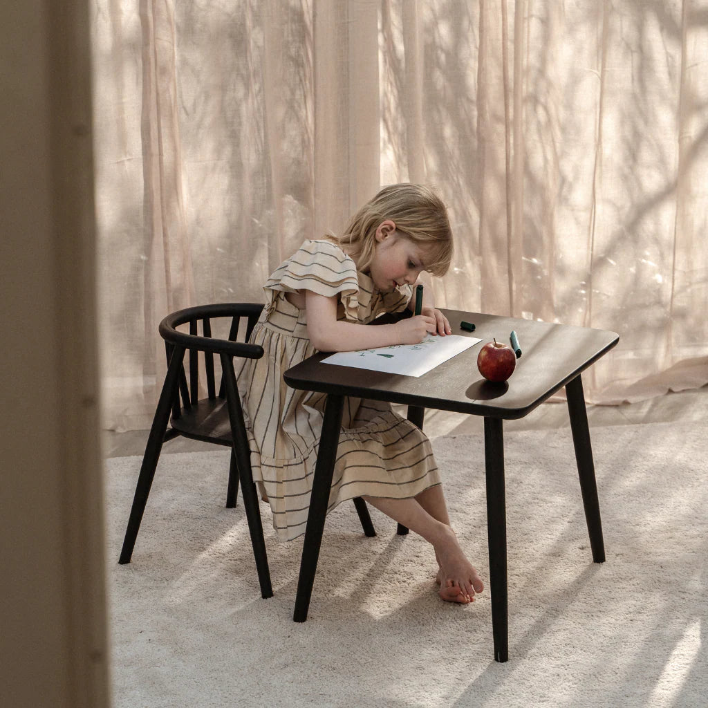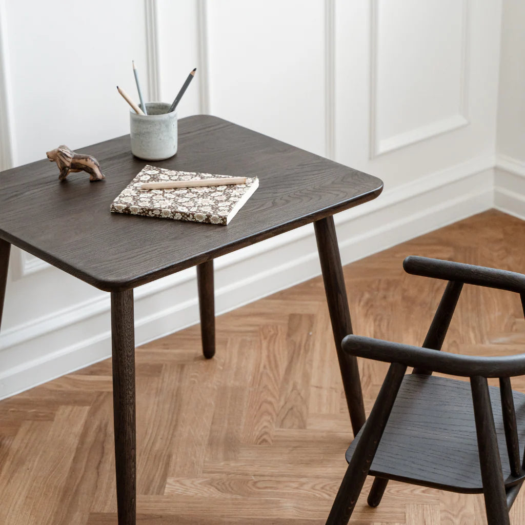 Oaklings Asta børnebord i røget eg er designet af Nina Bruun i 2023 som det perfekte match til Storm børnestolen. De genkendelige silhuetter fra stolens ben går igen i bordets form, hvilket skaber en smuk og sammenhængende elegance i sættet.