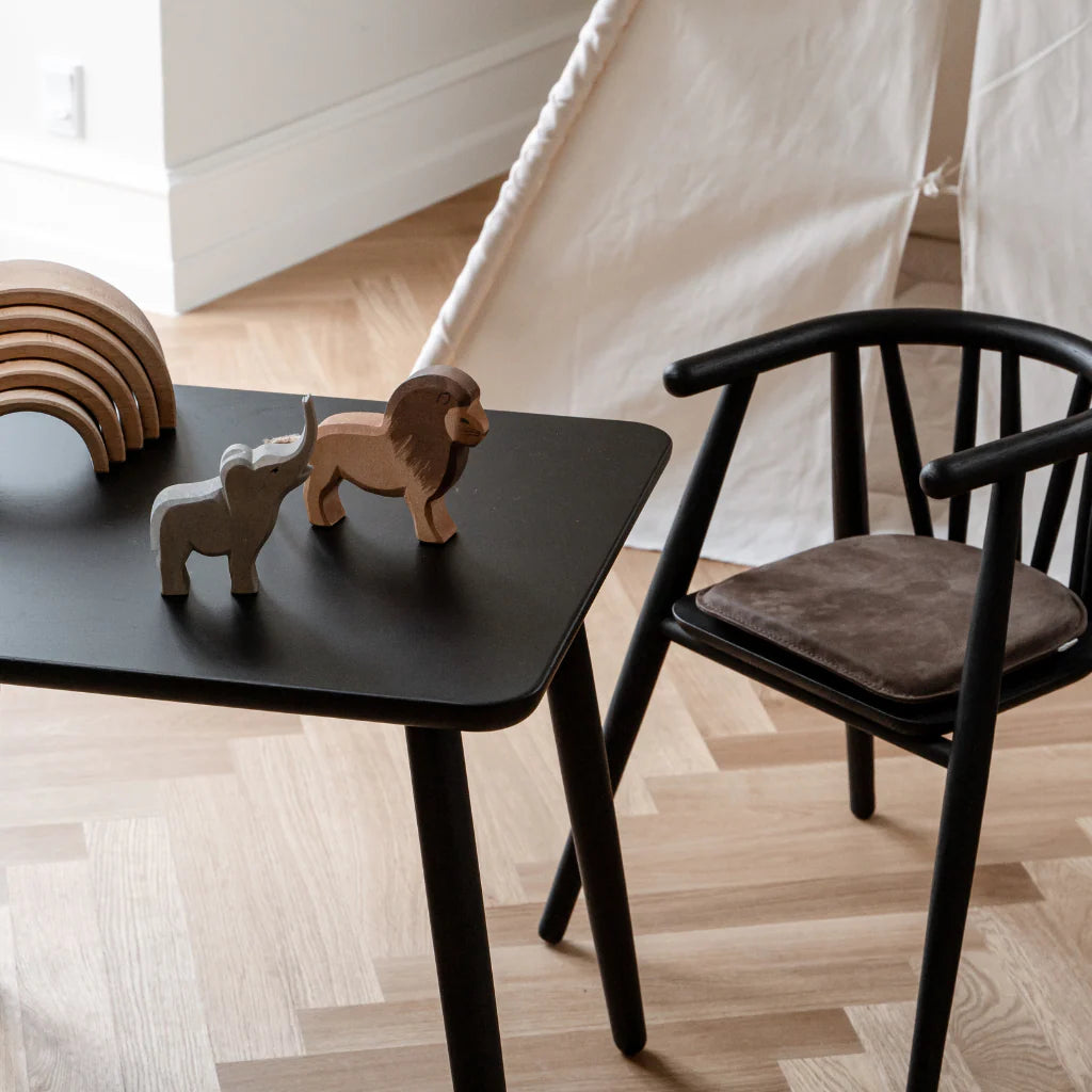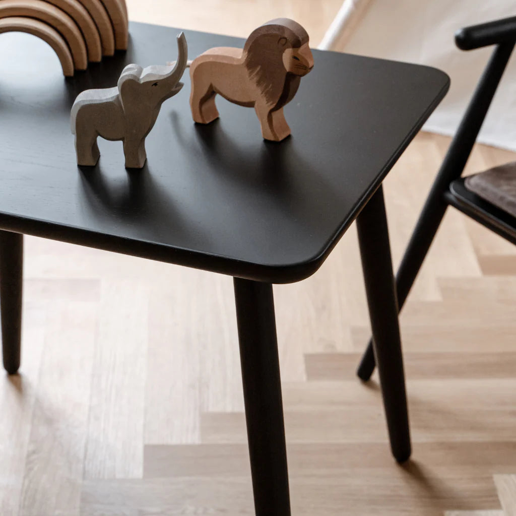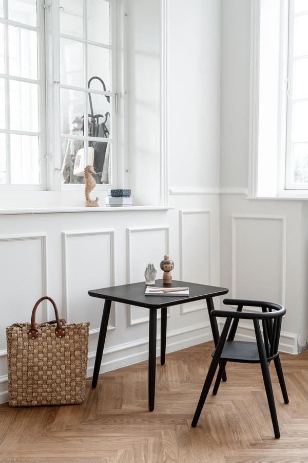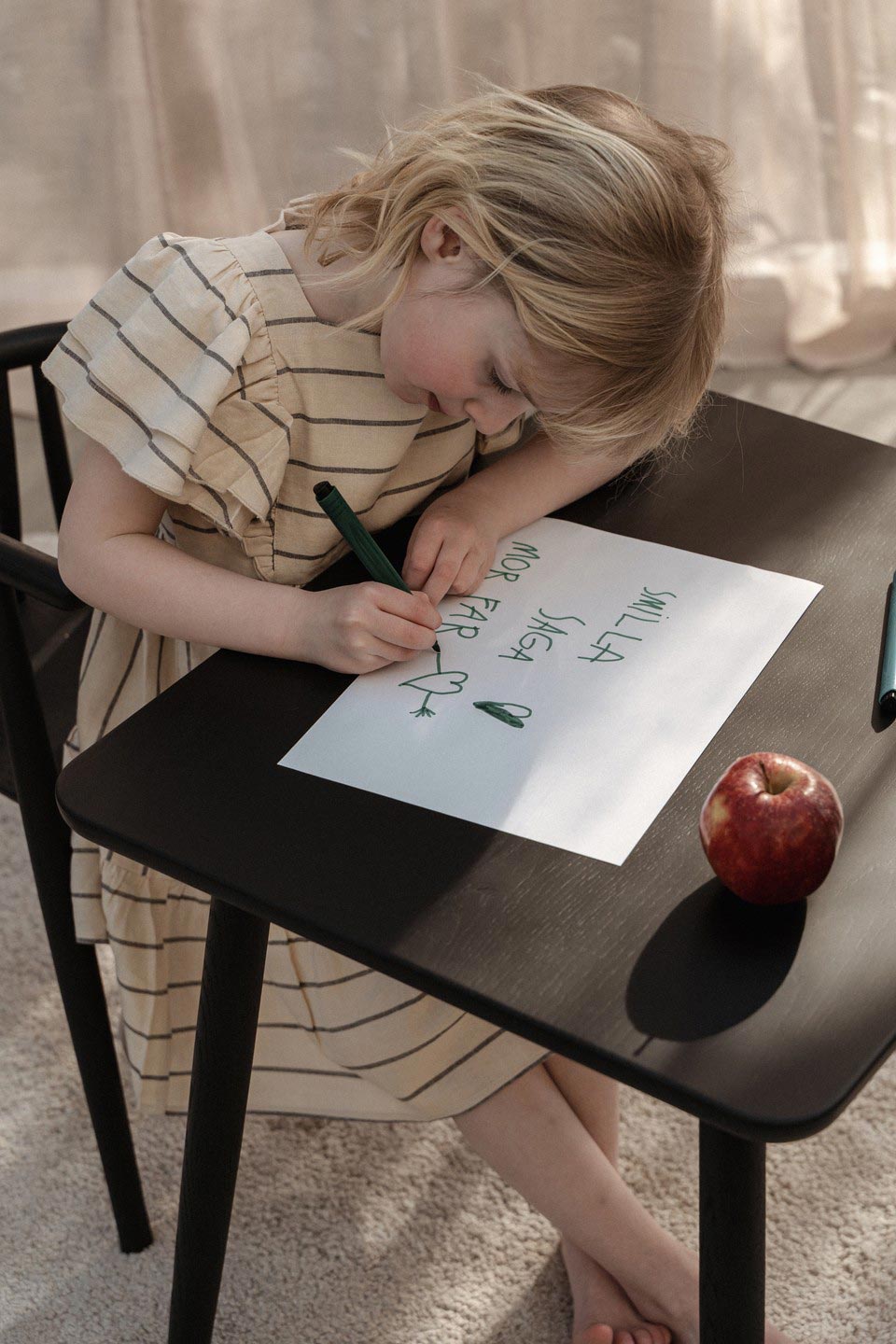 Bordhøjden er nøje afstemt, så bordpladen flugter med armlænet på Storm børnestolen og giver barnet en komfortabel position ved bordet. Bordet er fremstillet i FSC®-certificeret europæisk eg, som er sortmalet og behandlet med en mat, giftfri lak. De afrundede kanter tilfører et raffineret udtryk og sikrer, at bordet er trygt at bruge uden risiko for skarpe hjørner.